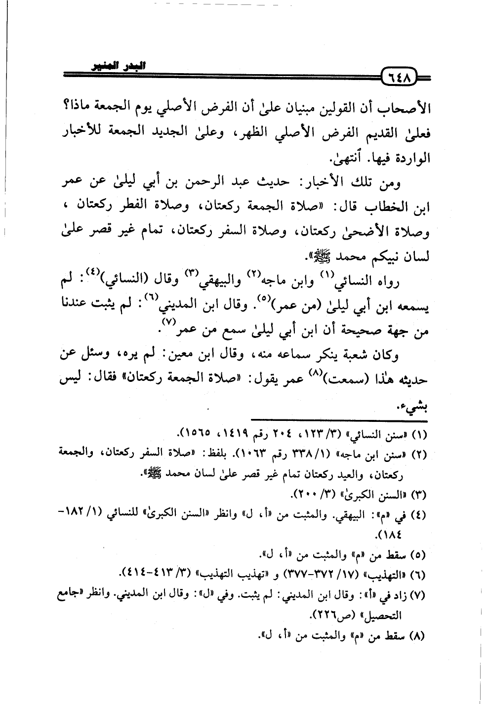 وَمن تِلْكَ الْأَخْبَار: حَدِيث عبد الرَّحْمَن بن أبي لَيْلَى عَن عمر بن الْخطاب قَالَ: «صَلَاة الْجُمُعَة رَكْعَتَانِ، وَصَلَاة الْفطر رَكْعَتَانِ، وَصَلَاة الْأَضْحَى رَكْعَتَانِ، وَصَلَاة السّفر رَكْعَتَانِ، تَمام غير قصر عَلَى لِسَان نَبِيكُم مُحَمَّد» .
