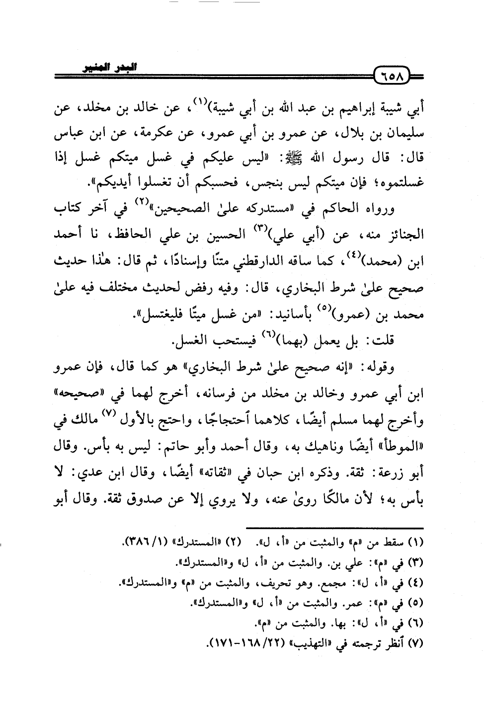 وَرَوَاهُ الْحَاكِم فِي «مُسْتَدْركه عَلَى الصَّحِيحَيْنِ» فِي آخر كتاب الْجَنَائِز مِنْهُ، عَن (أبي عَلّي) الْحُسَيْن بن عَلّي الْحَافِظ، نَا أَحْمد بن (مُحَمَّد) ، كَمَا سَاقه الدَّارَقُطْنِيّ متْنا وإسنادًا، ثمَّ قَالَ: هَذَا حَدِيث صَحِيح عَلَى شَرط البُخَارِيّ، قَالَ: وَفِيه رفض لحَدِيث مُخْتَلف فِيهِ عَلَى مُحَمَّد بن (عَمْرو) بأسانيد: «من غسل مَيتا فليغتسل» .