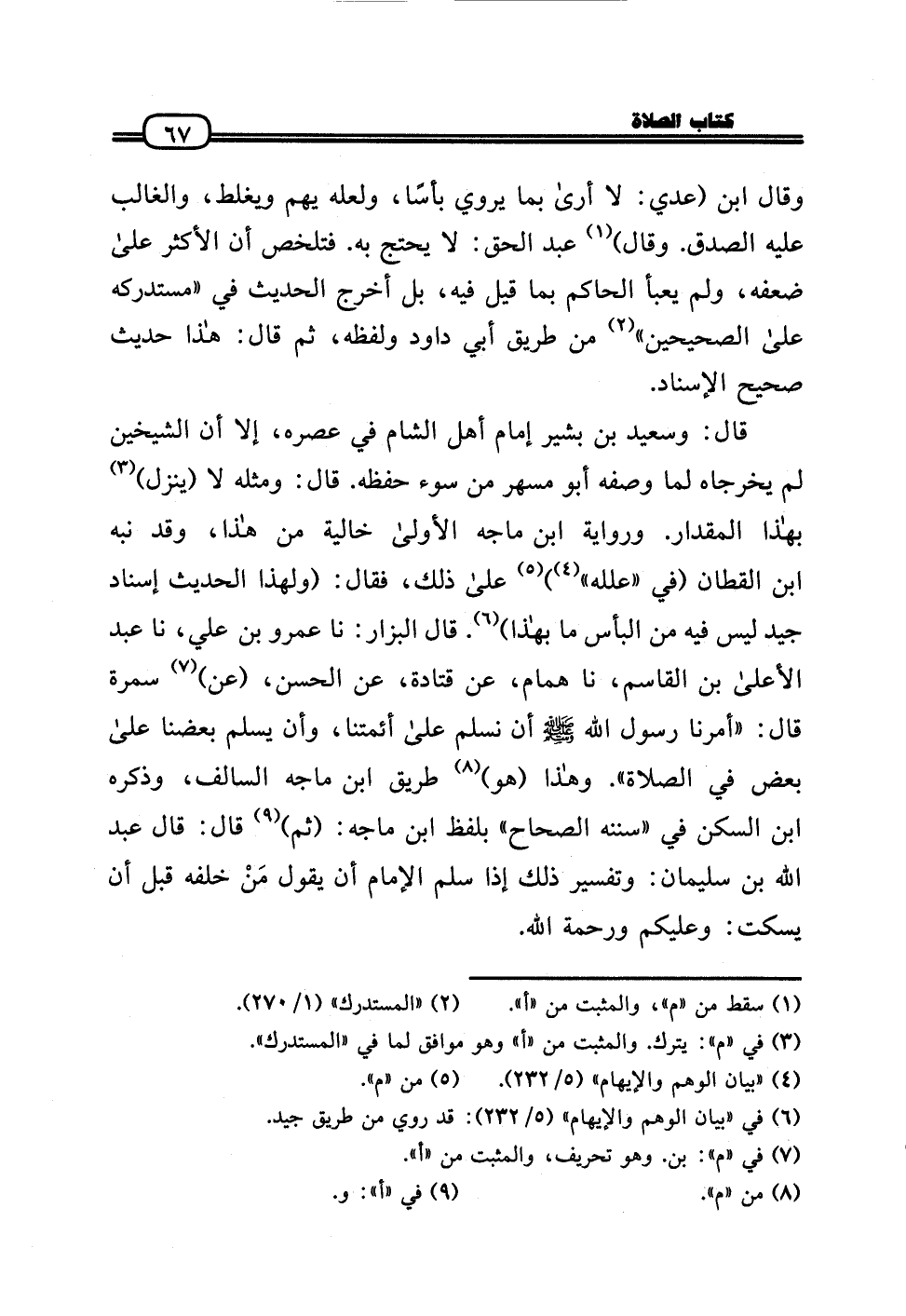 قَالَ: وَسَعِيد بن بشير إِمَام أهل الشَّام فِي عصره، إِلَّا أَن الشَّيْخَيْنِ لم يخرجَاهُ لما وَصفه أَبُو مسْهر من سوء حفظه. قَالَ: وَمثله لَا (ينزل) بِهَذَا الْمِقْدَار. وَرِوَايَة ابْن مَاجَه الأولَى خَالِيَة من هَذَا، وَقد نبه ابْن الْقطَّان (فِي «علله» ) عَلَى ذَلِك، فَقَالَ: (وَلِهَذَا الحَدِيث إِسْنَاد جيد لَيْسَ فِيهِ من الْبَأْس مَا بِهَذَا) . قَالَ الْبَزَّار: نَا عَمْرو بن عَلّي، نَا عبد الْأَعْلَى بن الْقَاسِم، نَا همام، عَن قَتَادَة، عَن الْحسن، (عَن) سَمُرَة قَالَ: «أمرنَا رَسُول الله - صَلَّى الله عَلَيْهِ وَسلم - أَن نسلم عَلَى أَئِمَّتنَا، وَأَن يسلم بَعْضنَا عَلَى بعض فِي الصَّلَاة» . وَهَذَا (هُوَ) طَرِيق ابْن مَاجَه السالف، وَذكره ابْن السكن فِي «سنَنه الصِّحَاح» بِلَفْظ ابْن مَاجَه: (ثمَّ) قَالَ: قَالَ عبد الله بن سُلَيْمَان: وَتَفْسِير ذَلِك إِذا سلم الإِمَام أَن يَقُول مَنْ خَلفه قبل أَن يسكت: وَعَلَيْكُم وَرَحْمَة الله.
