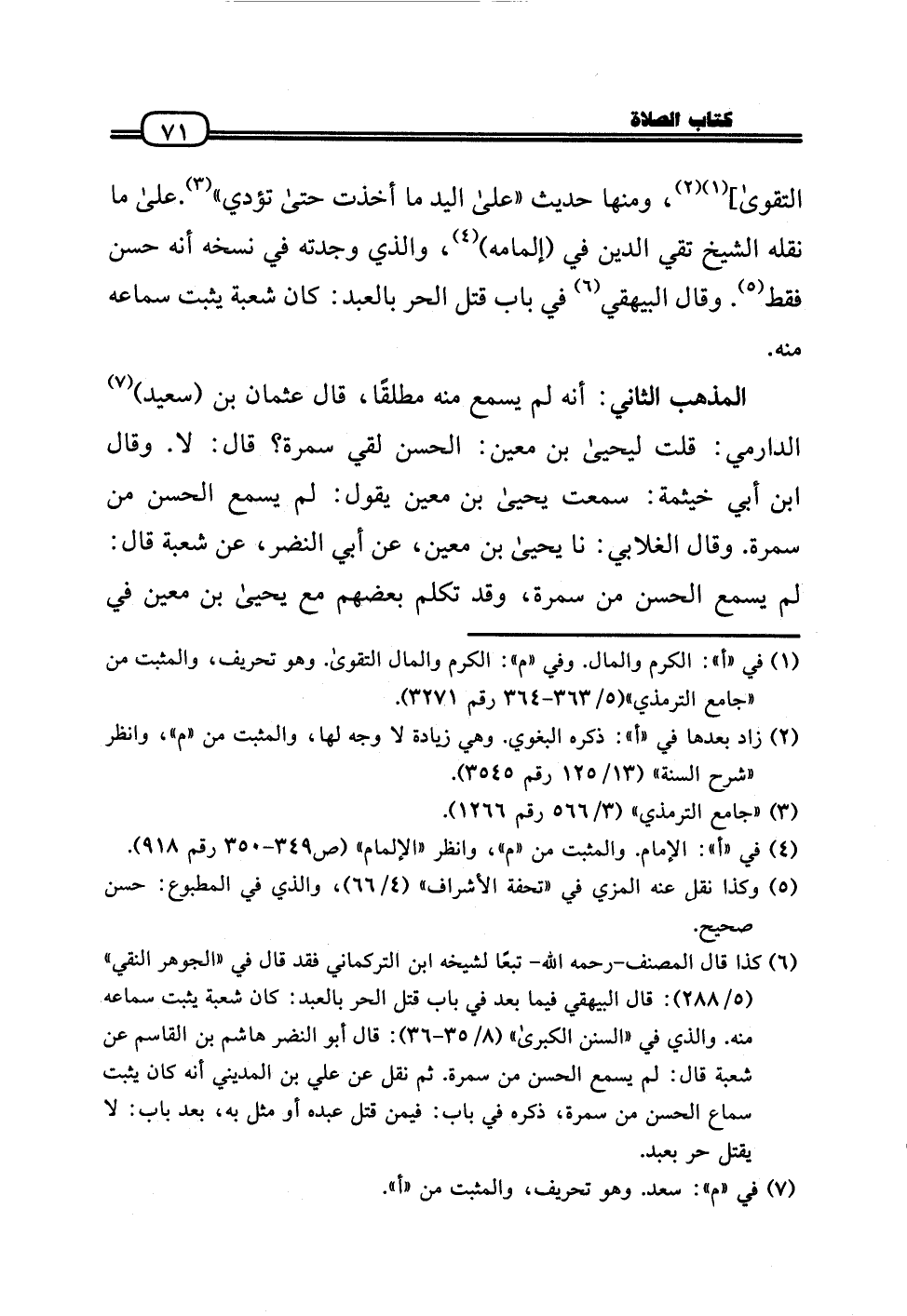 التَّقْوَى] ، وَمِنْهَا حَدِيث «عَلَى الْيَد مَا أخذت حَتَّى تُؤدِّي» . عَلَى مَا نَقله الشَّيْخ تَقِيّ الدَّين فِي (إلمامه) ، وَالَّذِي وجدته فِي نسخه أَنه حسن فَقَط. وَقَالَ الْبَيْهَقِيّ فِي بَاب قتل الْحر بِالْعَبدِ: كَانَ شُعْبَة يثبت سَمَاعه مِنْهُ.