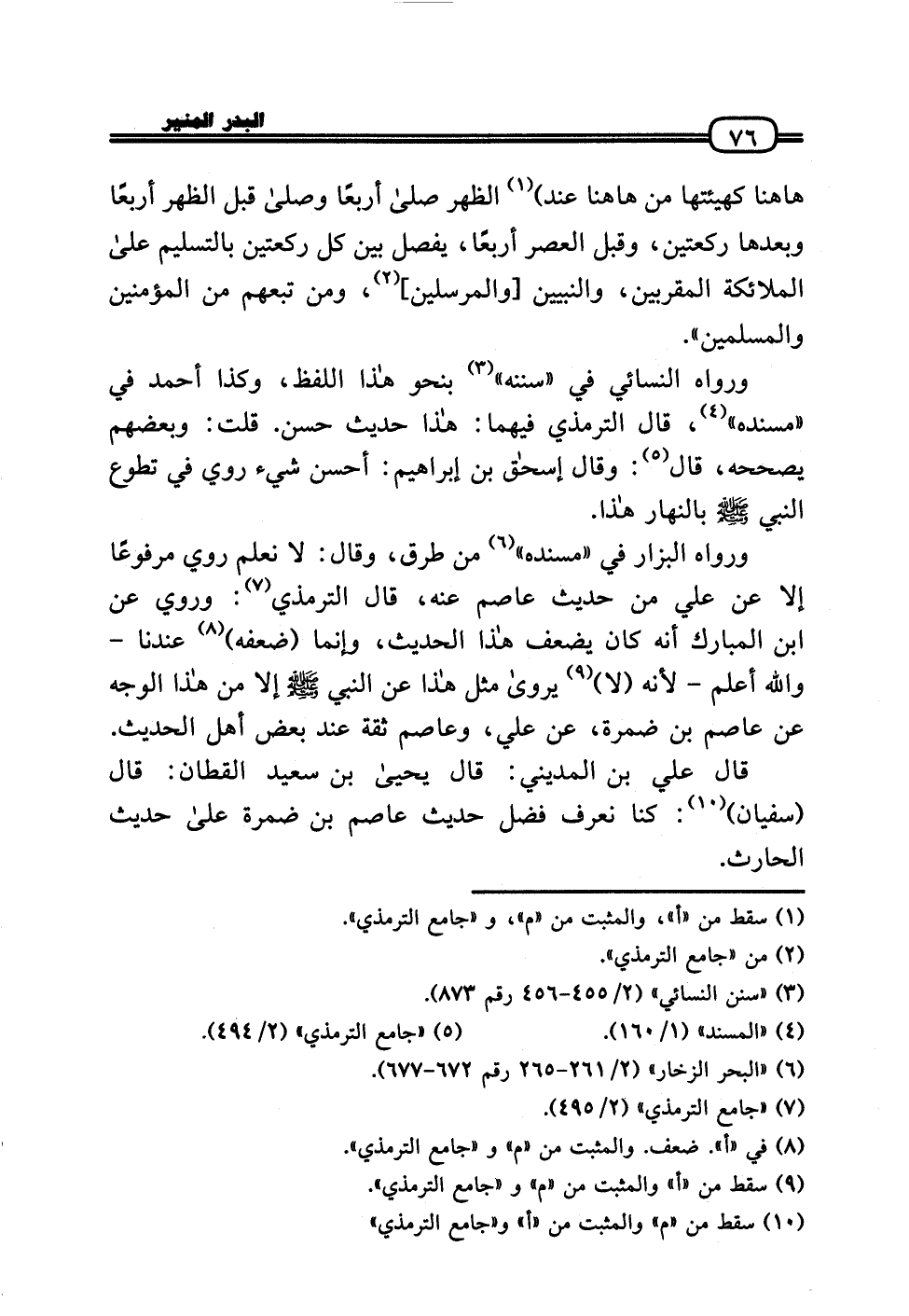 وَرَوَاهُ الْبَزَّار فِي «مُسْنده» من طرق، وَقَالَ: لَا نعلم رُوِيَ مَرْفُوعا إِلَّا عَن عَلّي من حَدِيث عَاصِم عَنهُ، قَالَ التِّرْمِذِيّ: وَرُوِيَ عَن ابْن الْمُبَارك أَنه كَانَ يضعف هَذَا الحَدِيث، وَإِنَّمَا (ضعفه) عندنَا - وَالله أعلم - لِأَنَّهُ (لَا) يرْوَى مثل هَذَا عَن النَّبِي - صَلَّى الله عَلَيْهِ وَسلم - إِلَّا من هَذَا الْوَجْه عَن عَاصِم بن ضَمرَة، عَن عَلّي، وَعَاصِم ثِقَة عِنْد بعض أهل الحَدِيث.