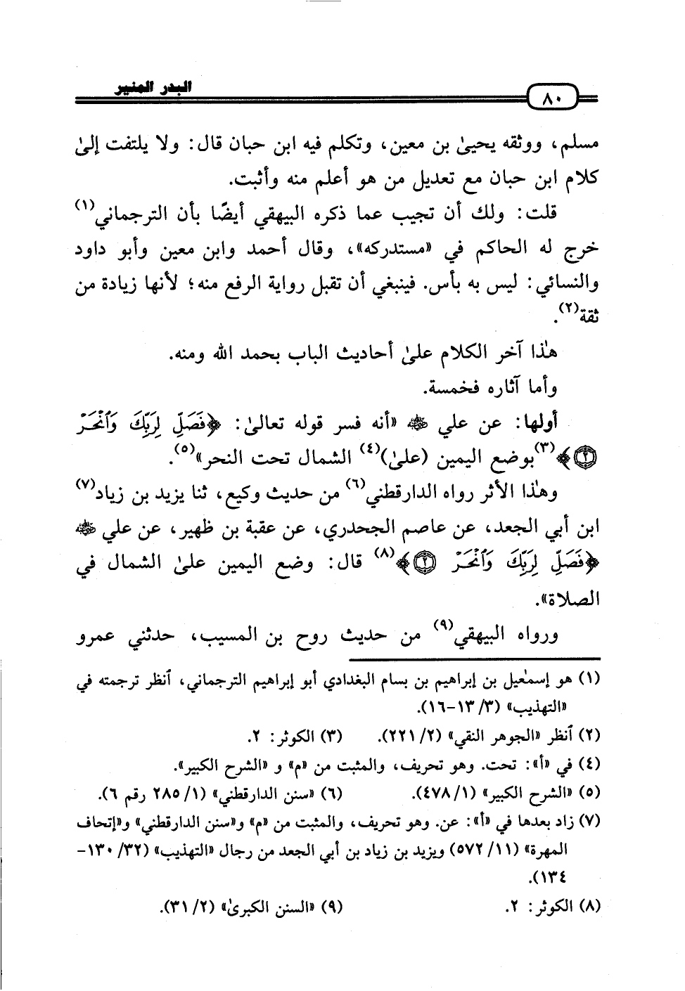 أَولهَا: عَن عَلّي رَضِيَ اللَّهُ عَنْه «أَنه فسر قَوْله تَعَالَى: (فصل لِرَبِّك وانحر) بِوَضْع الْيَمين (عَلَى) الشمَال تَحت النَّحْر» .