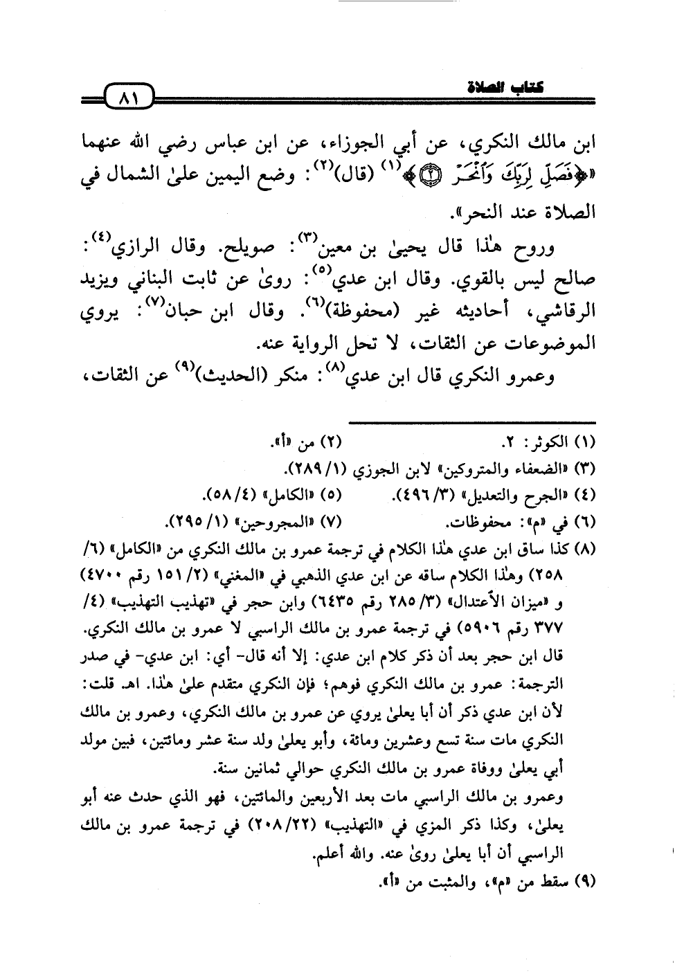 بن مَالك النكري، عَن أبي الجوزاء، عَن ابْن عَبَّاس رَضِيَ اللَّهُ عَنْهما «فصل لِرَبِّك وانحر) (قَالَ) : وضع الْيَمين عَلَى الشمَال فِي الصَّلَاة عِنْد النَّحْر» .