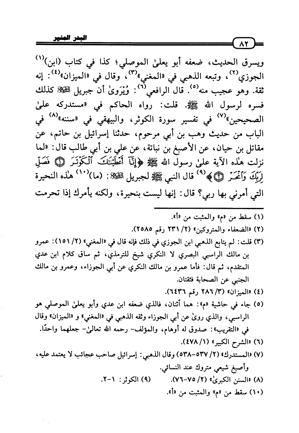 وَيسْرق الحَدِيث، ضعفه أَبُو يعْلى الْموصِلِي؛ كَذَا فِي كتاب (ابْن) الْجَوْزِيّ، وَتَبعهُ الذَّهَبِيّ فِي «الْمُغنِي» ، وَقَالَ فِي (الْمِيزَان) : إِنَّه ثِقَة. وَهُوَ عَجِيب مِنْهُ. قَالَ الرَّافِعِيّ: وُيْرَوى أَن جِبْرِيل عَلَيْهِ السَّلَام كَذَلِك فسره لرَسُول الله - صَلَّى الله عَلَيْهِ وَسلم -. قلت: رَوَاهُ الْحَاكِم فِي «مُسْتَدْركه عَلَى الصَّحِيحَيْنِ» فِي تَفْسِير سُورَة الْكَوْثَر، وَالْبَيْهَقِيّ فِي «سنَنه» فِي الْبَاب من حَدِيث وهب بن أبي مَرْحُوم، حَدثنَا إِسْرَائِيل بن حَاتِم، عَن مقَاتل بن حَيَّان، عَن الْأَصْبَغ بن نباتة، عَن عَلّي بن أبي طَالب قَالَ: «لما نزلت هَذِه الْآيَة عَلَى رَسُول الله - صَلَّى الله عَلَيْهِ وَسلم - (إِنَّا أعطيناك الْكَوْثَر * فصل لِرَبِّك وانحر) قَالَ النَّبِي - صَلَّى الله عَلَيْهِ وَسلم - لجبريل عَلَيْهِ السَّلَام: (مَا) هَذِه النحيرة الَّتِي أَمرنِي بهَا رَبِّي؟ قَالَ: إِنَّهَا لَيست بنحيرة، وَلكنه يَأْمُرك إِذا تحرمت