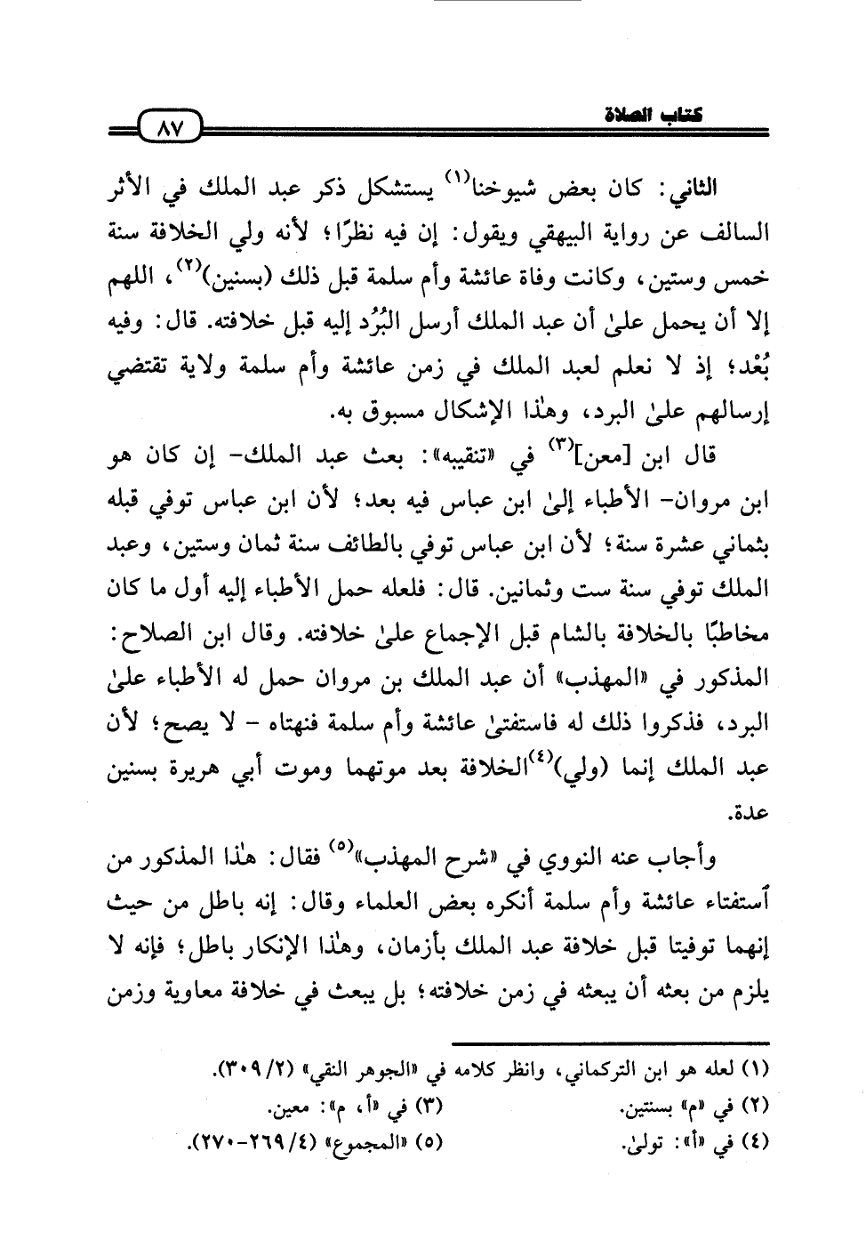 الثَّانِي: كَانَ بعض شُيُوخنَا يسْتَشْكل ذكر عبد الْملك فِي الْأَثر السالف عَن رِوَايَة الْبَيْهَقِيّ وَيَقُول: إِن فِيهِ نظرا؛ لِأَنَّهُ ولي الْخلَافَة سنة خمس وَسِتِّينَ، وَكَانَت وَفَاة عَائِشَة وَأم سَلمَة قبل ذَلِك (بسنين) ، اللَّهُمَّ إِلَّا أَن يحمل عَلَى أَن عبد الْملك أرسل البُرُد إِلَيْهِ قبل خِلَافَته. قَالَ: وَفِيه بُعْد؛ إِذْ لَا نعلم لعبد الْملك فِي زمن عَائِشَة وَأم سَلمَة ولَايَة تَقْتَضِي إرسالهم عَلَى الْبرد، وَهَذَا الْإِشْكَال مَسْبُوق بِهِ.