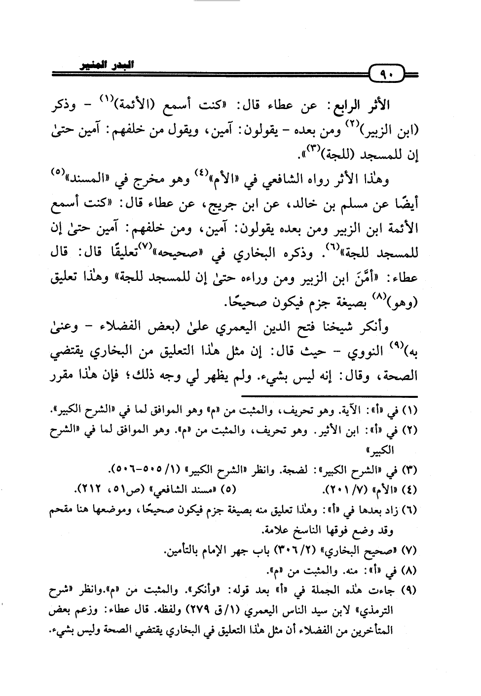 وَهَذَا الْأَثر رَوَاهُ الشَّافِعِي فِي «الْأُم» وَهُوَ مخرج فِي «الْمسند» أَيْضا عَن مُسلم بن خَالِد، عَن ابْن جريج، عَن عَطاء قَالَ: «كنت أسمع الْأَئِمَّة ابْن الزبير وَمن بعده يَقُولُونَ: آمين، وَمن خَلفهم: آمين حَتَّى إِن لِلْمَسْجِدِ للجة» . وَذكره البُخَارِيّ فِي «صَحِيحه» تَعْلِيقا قَالَ: قَالَ عَطاء: «أمَّنَ ابْن الزبير وَمن وَرَاءه حَتَّى إِن لِلْمَسْجِدِ للجة» وَهَذَا تَعْلِيق (وَهُوَ) بِصِيغَة جزم فَيكون صَحِيحا.