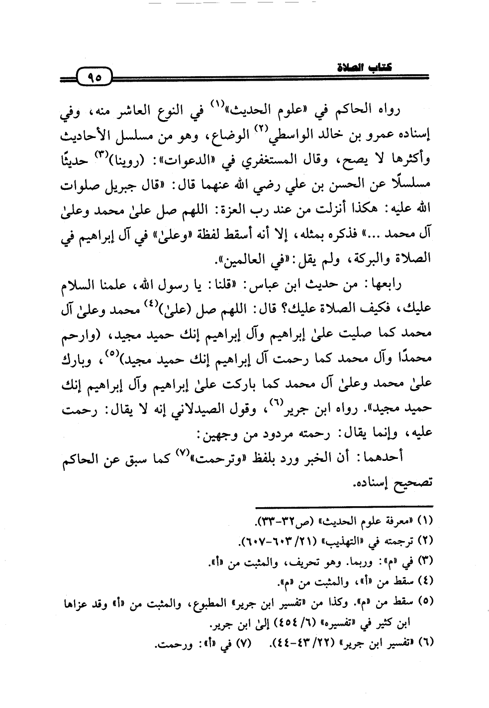 رَابِعهَا: من حَدِيث ابْن عَبَّاس: «قُلْنَا: يَا رَسُول الله، علمنَا السَّلَام عَلَيْك، فَكيف الصَّلَاة عَلَيْك؟ قَالَ: اللَّهُمَّ صل (عَلَى) مُحَمَّد وَعَلَى آل مُحَمَّد كَمَا صليت عَلَى إِبْرَاهِيم وَآل إِبْرَاهِيم إِنَّك حميد مجيد، (وَارْحَمْ مُحَمَّدًا وَآل مُحَمَّد كَمَا رحمت آل إِبْرَاهِيم إِنَّك حميد مجيد) ، وَبَارك عَلَى مُحَمَّد وَعَلَى آل مُحَمَّد كَمَا باركت عَلَى إِبْرَاهِيم وَآل إِبْرَاهِيم إِنَّك حميد مجيد» . رَوَاهُ ابْن جرير، وَقَول الصيدلاني إِنَّه لَا يُقَال: رحمت عَلَيْهِ، وَإِنَّمَا يُقَال: رَحمته مَرْدُود من وَجْهَيْن: