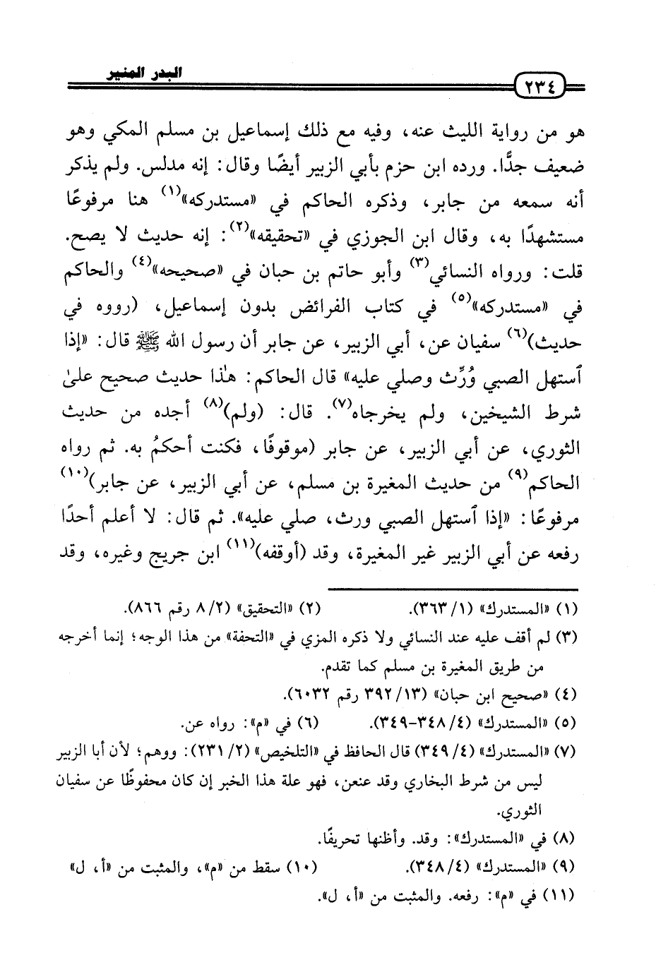 هُوَ من رِوَايَة اللَّيْث عَنهُ، وَفِيه مَعَ ذَلِك إِسْمَاعِيل بن مُسلم الْمَكِّيّ وَهُوَ ضَعِيف جدًّا. ورده ابْن حزم بِأبي الزبير أَيْضا وَقَالَ: إِنَّه مُدَلّس. وَلم يذكر أَنه سَمعه من جَابر، وَذكره الْحَاكِم فِي «مُسْتَدْركه» هُنَا مَرْفُوعا مستشهدًا بِهِ، وَقَالَ ابْن الْجَوْزِيّ فِي «تَحْقِيقه» : إِنَّه حَدِيث لَا يَصح. قلت: وَرَوَاهُ النَّسَائِيّ وَأَبُو حَاتِم بن حبَان فِي «صَحِيحه» وَالْحَاكِم فِي «مُسْتَدْركه» فِي كتاب الْفَرَائِض بِدُونِ إِسْمَاعِيل، (رَوَوْهُ فِي حَدِيث) سُفْيَان عَن، أبي الزبير، عَن جَابر أَن رَسُول الله - صَلَّى الله عَلَيْهِ وَسلم - قَالَ: «إِذا اسْتهلّ الصَّبِي وُرِّث وَصلي عَلَيْهِ» قَالَ الْحَاكِم: هَذَا حَدِيث صَحِيح عَلَى شَرط الشَّيْخَيْنِ، وَلم يخرجَاهُ. قَالَ: (وَلم) أَجِدهُ من حَدِيث الثَّوْريّ، عَن أبي الزبير، عَن جَابر (مَوْقُوفا، فَكنت أحكمُ بِهِ. ثمَّ رَوَاهُ الْحَاكِم من حَدِيث الْمُغيرَة بن مُسلم، عَن أبي الزبير، عَن جَابر) مَرْفُوعا: «إِذا اسْتهلّ الصَّبِي ورث، صلي عَلَيْهِ» . ثمَّ قَالَ: لَا أعلم أحدا رَفعه عَن أبي الزبير غير الْمُغيرَة، وَقد (أوقفهُ) ابْن جريج وَغَيره، وَقد