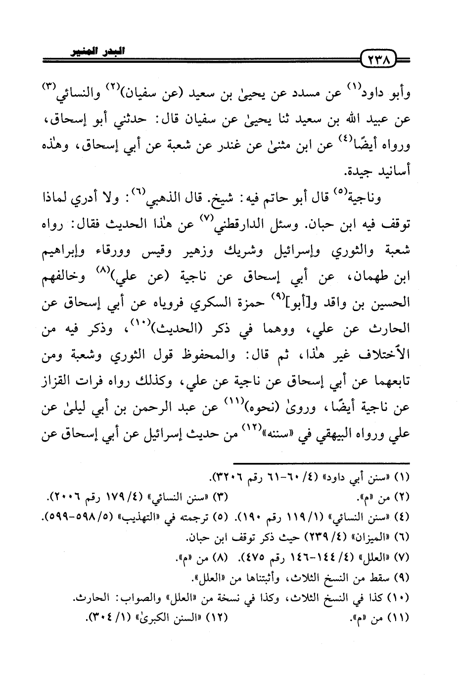 وَنَاجِيَة قَالَ أَبُو حَاتِم فِيهِ: شيخ. قَالَ الذَّهَبِيّ: وَلَا أَدْرِي لماذا توقف فِيهِ ابْن حبَان. وَسُئِلَ الدَّارَقُطْنِيّ عَن هَذَا الحَدِيث فَقَالَ: رَوَاهُ شُعْبَة وَالثَّوْري وَإِسْرَائِيل وَشريك وَزُهَيْر وَقيس وورقاء وَإِبْرَاهِيم بن طهْمَان، عَن أبي إِسْحَاق عَن نَاجِية (عَن عَلّي) وَخَالفهُم الْحُسَيْن بن وَاقد و [أَبُو] حَمْزَة السكرِي فروياه عَن أبي إِسْحَاق عَن الْحَارِث عَن عَلّي، ووهما فِي ذكر (الحَدِيث) ، وَذكر فِيهِ من الِاخْتِلَاف غير هَذَا، ثمَّ قَالَ: وَالْمَحْفُوظ قَول الثَّوْريّ وَشعْبَة وَمن تابعهما عَن أبي إِسْحَاق عَن نَاجِية عَن عَلّي، وَكَذَلِكَ رَوَاهُ فرات الْقَزاز عَن نَاجِية أَيْضا، وَرَوَى (نَحوه) عَن عبد الرَّحْمَن بن أبي لَيْلَى عَن عَلّي وَرَوَاهُ الْبَيْهَقِيّ فِي «سنَنه» من حَدِيث إِسْرَائِيل عَن أبي إِسْحَاق عَن