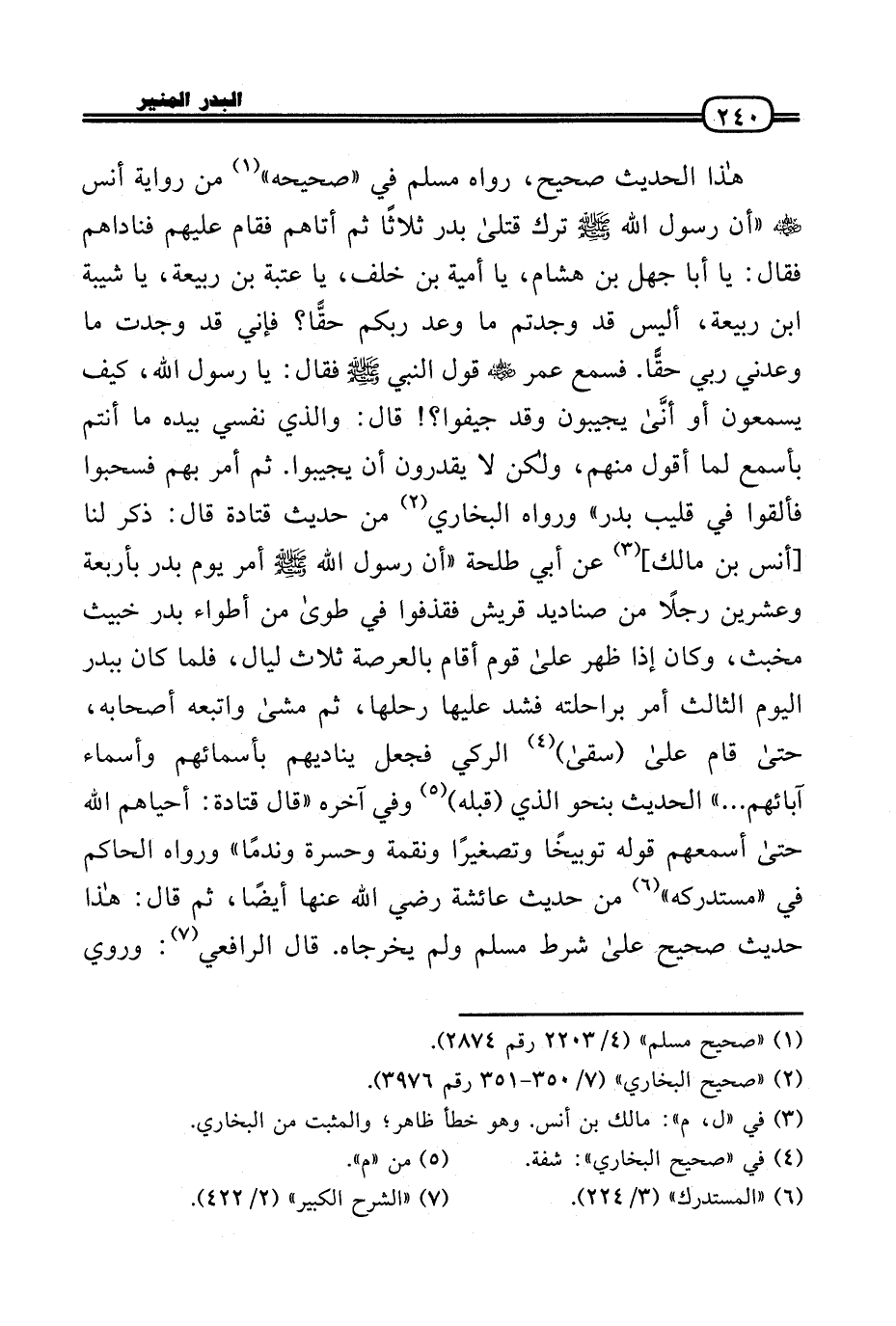 هَذَا الحَدِيث صَحِيح، رَوَاهُ مُسلم فِي «صَحِيحه» من رِوَايَة أنس رَضِيَ اللَّهُ عَنْه «أَن رَسُول الله - صَلَّى الله عَلَيْهِ وَسلم - ترك قَتْلَى بدر ثَلَاثًا ثمَّ أَتَاهُم فَقَامَ عَلَيْهِم فناداهم فَقَالَ: يَا أَبَا جهل بن هِشَام، يَا أُميَّة بن خلف، يَا عتبَة بن ربيعَة، يَا شيبَة بن ربيعَة، أَلَيْسَ قد وجدْتُم مَا وعد ربكُم حقًّا؟ فَإِنِّي قد وجدت مَا وَعَدَني رَبِّي حقًّا. فَسمع عمر رَضِيَ اللَّهُ عَنْه قَول النَّبِي - صَلَّى الله عَلَيْهِ وَسلم - فَقَالَ: يَا رَسُول الله، كَيفَ يسمعُونَ أَو أنَّى يجيبون وَقد جيفوا؟ ! قَالَ: وَالَّذِي نَفسِي بِيَدِهِ مَا أَنْتُم بأسمع لما أَقُول مِنْهُم، وَلَكِن لَا يقدرُونَ أَن يجيبوا. ثمَّ أَمر بهم فسحبوا فَألْقوا فِي قليب بدر» وَرَوَاهُ البُخَارِيّ من حَدِيث قَتَادَة قَالَ: ذكر لنا [أنس بن مَالك] عَن أبي طَلْحَة «أَن رَسُول الله - صَلَّى الله عَلَيْهِ وَسلم - أَمر يَوْم بدر بأَرْبعَة وَعشْرين رجلا من صَنَادِيد قُرَيْش فقذفوا فِي طوى من أطواء بدر خَبِيث مخبث، وَكَانَ إِذا ظهر عَلَى قوم أَقَامَ بالعرصة ثَلَاث لَيَال، فَلَمَّا كَانَ ببدر الْيَوْم الثَّالِث أَمر براحلته فَشد عَلَيْهَا رَحلهَا، ثمَّ مَشَى وَاتبعهُ أَصْحَابه، حَتَّى قَامَ عَلَى (سَقَى) الركي فَجعل يناديهم بِأَسْمَائِهِمْ وَأَسْمَاء آبَائِهِم ... » الحَدِيث بِنَحْوِ الَّذِي (قبله) وَفِي آخِره «قَالَ قَتَادَة: أحياهم الله حَتَّى أسمعهم قَوْله توبيخًا وتصغيرًا ونقمة وحسرة وندمًا» وَرَوَاهُ الْحَاكِم فِي «مُسْتَدْركه» من حَدِيث عَائِشَة رَضِيَ اللَّهُ عَنْها أَيْضا، ثمَّ قَالَ: هَذَا حَدِيث صَحِيح عَلَى شَرط مُسلم وَلم يخرجَاهُ. قَالَ الرَّافِعِيّ: وَرُوِيَ