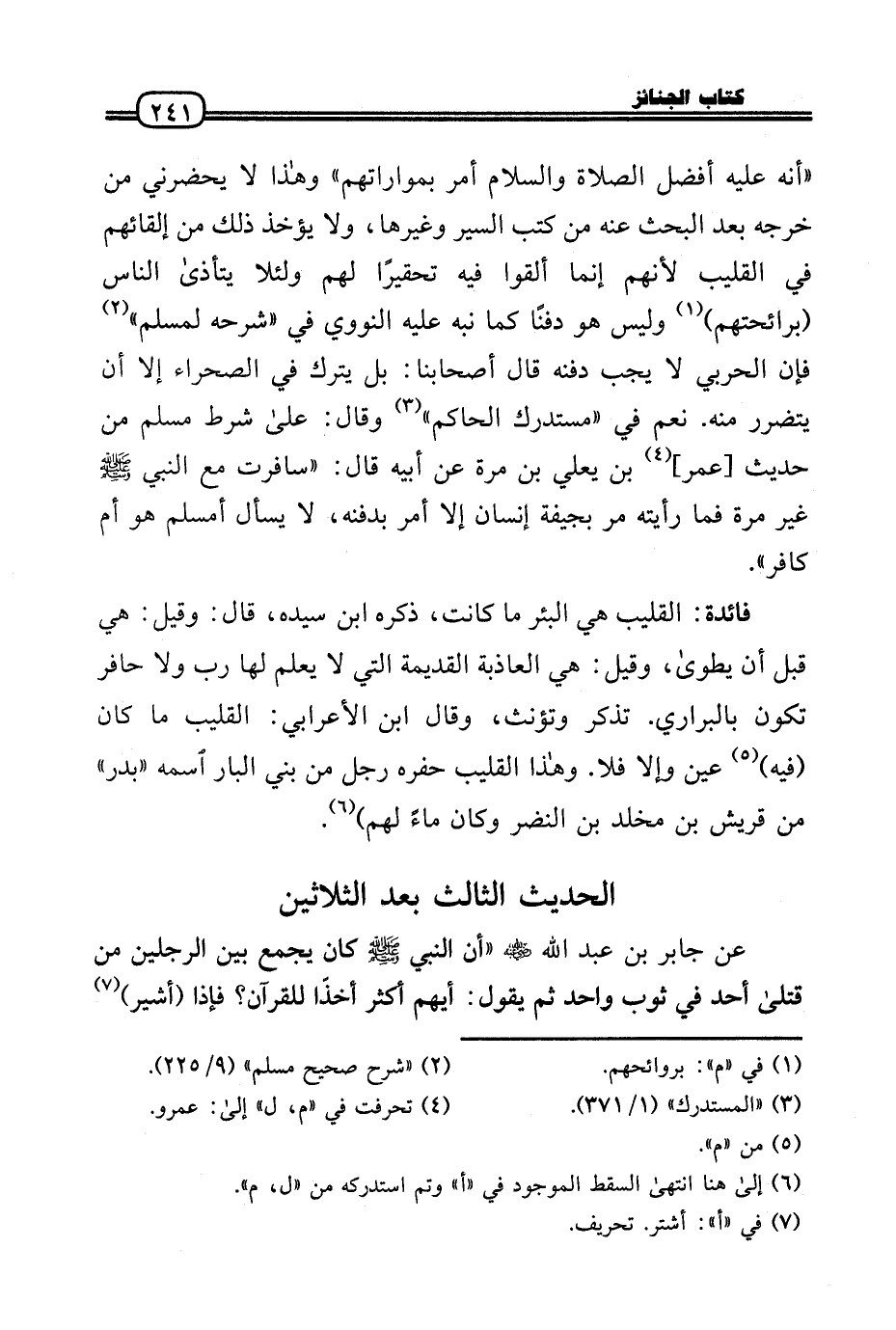 «أَنه عَلَيْهِ أفضل الصَّلَاة وَالسَّلَام أَمر بمواراتهم» وَهَذَا لَا يحضرني من خرجه بعد الْبَحْث عَنهُ من كتب السّير وَغَيرهَا، وَلَا يُؤْخَذ ذَلِك من إلقائهم فِي القليب لأَنهم إِنَّمَا ألقوا فِيهِ تحقيرًا لَهُم وَلِئَلَّا يتَأَذَّى النَّاس (برائحتهم) وَلَيْسَ هُوَ دفنًا كَمَا نبه عَلَيْهِ النَّوَوِيّ فِي «شَرحه لمُسلم» فَإِن الْحَرْبِيّ لَا يجب دَفنه قَالَ أَصْحَابنَا: بل يتْرك فِي الصَّحرَاء إِلَّا أَن يتَضَرَّر مِنْهُ. نعم فِي «مُسْتَدْرك الْحَاكِم» وَقَالَ: عَلَى شَرط مُسلم من حَدِيث [عمر] بن يعلي بن مرّة عَن أَبِيه قَالَ: «سَافَرت مَعَ النَّبِي - صَلَّى الله عَلَيْهِ وَسلم - غير مرّة فَمَا رَأَيْته مر بجيفة إِنْسَان إِلَّا أَمر بدفنه، لَا يسْأَل أمسلم هُوَ أم كَافِر» .