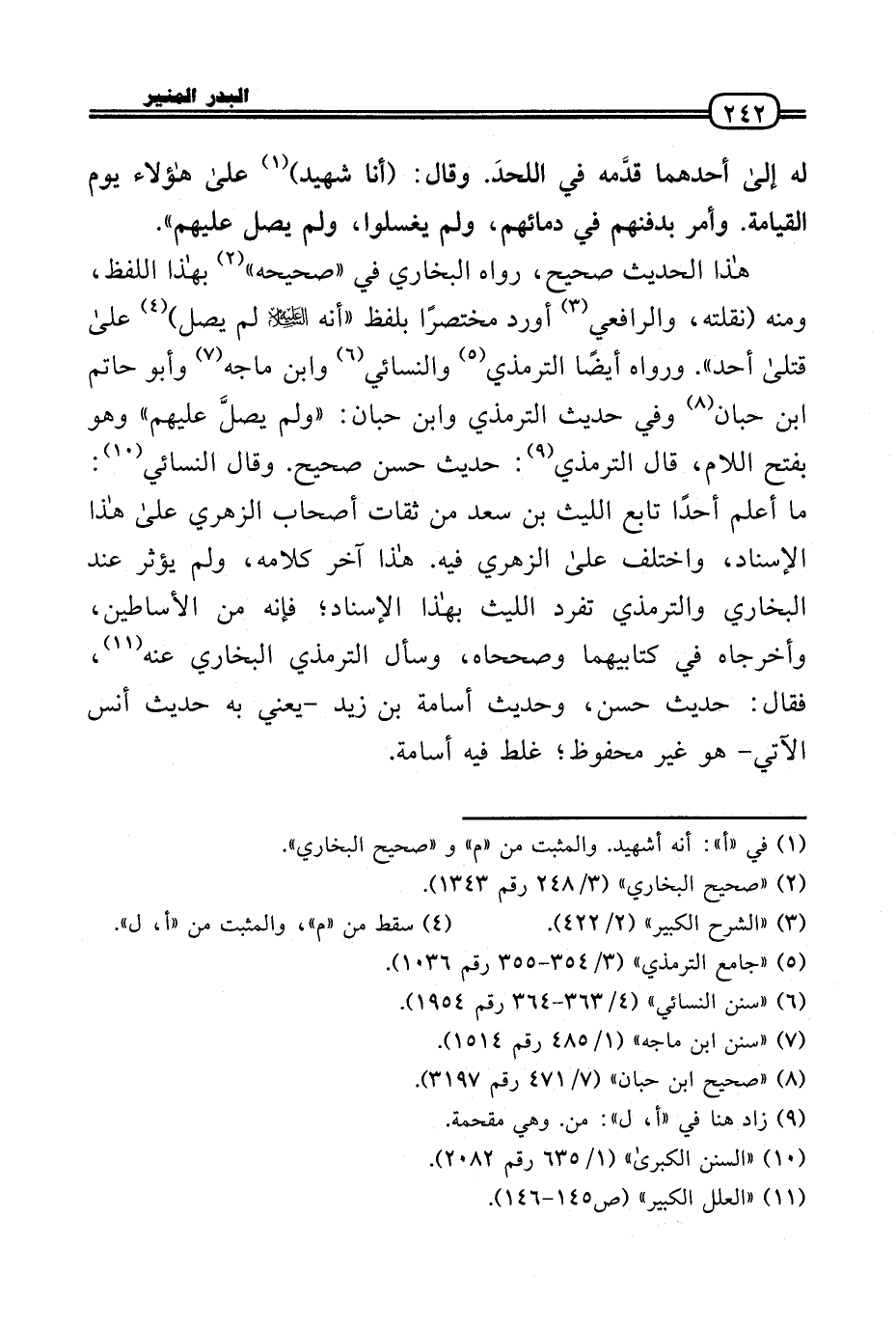 هَذَا الحَدِيث صَحِيح، رَوَاهُ البُخَارِيّ فِي «صَحِيحه» بِهَذَا اللَّفْظ، وَمِنْه (نقلته، والرافعي أورد مُخْتَصرا بِلَفْظ «أَنه عَلَيْهِ السَّلَام لم يصل) عَلَى قَتْلَى أحد» . وَرَوَاهُ أَيْضا التِّرْمِذِيّ وَالنَّسَائِيّ وَابْن مَاجَه وَأَبُو حَاتِم بن حبَان وَفِي حَدِيث التِّرْمِذِيّ وَابْن حبَان: «وَلم يصلَّ عَلَيْهِم» وَهُوَ بِفَتْح اللَّام، قَالَ التِّرْمِذِيّ: حَدِيث حسن صَحِيح. وَقَالَ النَّسَائِيّ: مَا أعلم أحدا تَابع اللَّيْث بن سعد من ثِقَات أَصْحَاب الزُّهْرِيّ عَلَى هَذَا الْإِسْنَاد، وَاخْتلف عَلَى الزُّهْرِيّ فِيهِ. هَذَا آخر كَلَامه، وَلم يُؤثر عِنْد البُخَارِيّ وَالتِّرْمِذِيّ تفرد اللَّيْث بِهَذَا الْإِسْنَاد؛ فَإِنَّهُ من الأساطين، وَأَخْرَجَاهُ فِي كِتَابَيْهِمَا وصححاه، وَسَأَلَ التِّرْمِذِيّ البُخَارِيّ عَنهُ، فَقَالَ: حَدِيث حسن، وَحَدِيث أُسَامَة بن زيد - يَعْنِي بِهِ حَدِيث أنس الْآتِي - هُوَ غير مَحْفُوظ؛ غلط فِيهِ أُسَامَة.