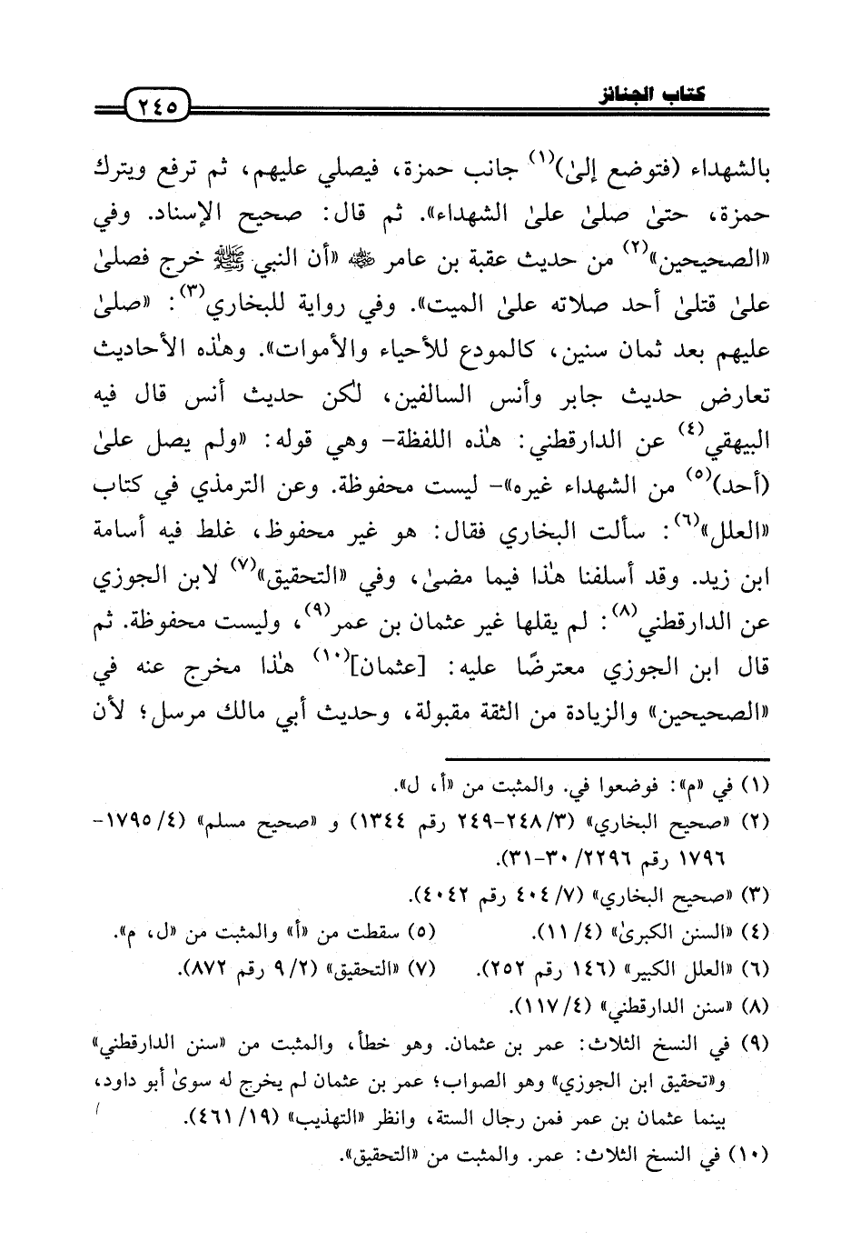 بِالشُّهَدَاءِ (فتوضع إِلَى) جَانب حَمْزَة، فَيصَلي عَلَيْهِم، ثمَّ ترفع وَيتْرك حَمْزَة، حَتَّى صَلَّى عَلَى الشُّهَدَاء» . ثمَّ قَالَ: صَحِيح الْإِسْنَاد. وَفِي «الصَّحِيحَيْنِ» من حَدِيث عقبَة بن عَامر رَضِيَ اللَّهُ عَنْه «أَن النَّبِي - صَلَّى الله عَلَيْهِ وَسلم - خرج فَصَلى عَلَى قَتْلَى أحد صلَاته عَلَى الْمَيِّت» . وَفِي رِوَايَة للْبُخَارِيّ: «صَلَّى عَلَيْهِم بعد ثَمَان سِنِين، كَالْمُودعِ للأحياء والأموات» . وَهَذِه الْأَحَادِيث تعَارض حَدِيث جَابر وَأنس السالفين، لَكِن حَدِيث أنس قَالَ فِيهِ الْبَيْهَقِيّ عَن الدَّارَقُطْنِيّ: هَذِه اللَّفْظَة - وَهِي قَوْله: «وَلم يصل عَلَى (أحد) من الشُّهَدَاء غَيره» - لَيست مَحْفُوظَة. وَعَن التِّرْمِذِيّ فِي كتاب «الْعِلَل» : سَأَلت البُخَارِيّ فَقَالَ: هُوَ غير مَحْفُوظ، غلط فِيهِ أُسَامَة بن زيد. وَقد أسلفنا هَذَا فِيمَا مَضَى، وَفِي «التَّحْقِيق» لِابْنِ الْجَوْزِيّ عَن الدَّارَقُطْنِيّ: لم يقلها غير عُثْمَان بن عمر، وَلَيْسَت مَحْفُوظَة. ثمَّ قَالَ ابْن الْجَوْزِيّ مُعْتَرضًا عَلَيْهِ: [عُثْمَان] هَذَا مخرج عَنهُ فِي «الصَّحِيحَيْنِ» وَالزِّيَادَة من الثِّقَة مَقْبُولَة، وَحَدِيث أبي مَالك مُرْسل؛ لِأَن