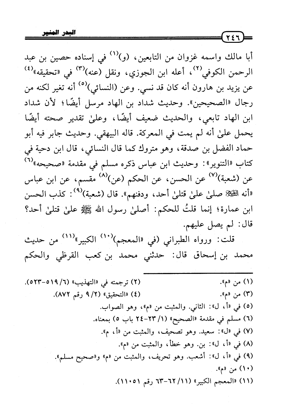 أَبَا مَالك واسْمه غَزوَان من التَّابِعين، (و) فِي إِسْنَاده حُصَيْن بن عبد الرَّحْمَن الْكُوفِي، أعله ابْن الْجَوْزِيّ، وَنقل (عَنهُ) فِي «تَحْقِيقه» عَن يزِيد بن هَارُون أَنه كَانَ قد نسي. وَعَن (النَّسَائِيّ) أَنه تغير لكنه من رجال «الصَّحِيحَيْنِ» . وَحَدِيث شَدَّاد بن الْهَاد مُرْسل أَيْضا؛ لِأَن شَدَّاد بن الْهَاد تَابِعِيّ، والْحَدِيث ضَعِيف أَيْضا، وَعَلَى تَقْدِير صِحَّته أَيْضا يحمل عَلَى أَنه لم يمت فِي المعركة. قَالَه الْبَيْهَقِيّ. وَحَدِيث جَابر فِيهِ أَبُو حَمَّاد الْفضل بن صَدَقَة، وَهُوَ مَتْرُوك كَمَا قَالَ النَّسَائِيّ، قَالَ ابْن دحْيَة فِي كتاب «التَّنْوِير» : وَحَدِيث ابْن عَبَّاس ذكره مُسلم فِي مُقَدّمَة «صَحِيحه» عَن (شُعْبَة) عَن الْحسن، عَن الحكم (عَن) مقسم، عَن ابْن عَبَّاس «أَنه عَلَيْهِ السَّلَام صَلَّى عَلَى قَتْلَى أحد، ودفنهم» . قَالَ (شُعْبَة) : كذب الْحسن بن عمَارَة؛ إِنَّمَا قلتُ للْحكم: أصلى رَسُول الله - صَلَّى الله عَلَيْهِ وَسلم - عَلَى قَتْلَى أحد؟ قَالَ: لم يصل عَلَيْهِم.