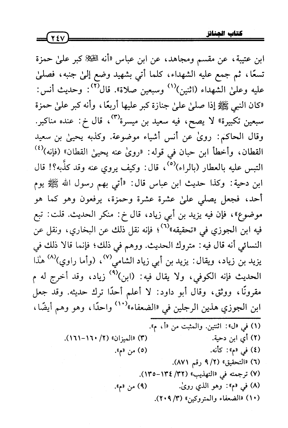 بن عتيبة، عَن مقسم وَمُجاهد، عَن ابْن عَبَّاس «أَنه عَلَيْهِ السَّلَام كبر عَلَى حَمْزَة تسعا، ثمَّ جمع عَلَيْهِ الشُّهَدَاء، كلما أُتِي بِشَهِيد وضع إِلَى جنبه، فَصَلى عَلَيْهِ وَعَلَى الشُّهَدَاء (اثْنَيْنِ) وَسبعين صَلَاة» . قَالَ: وَحَدِيث أنس: «كَانَ النَّبِي - صَلَّى الله عَلَيْهِ وَسلم - إِذا صَلَّى عَلَى جَنَازَة كبر عَلَيْهَا أَرْبعا، وَأَنه كبر عَلَى حَمْزَة سبعين تَكْبِيرَة» لَا يَصح، فِيهِ سعيد بن ميسرَة، قَالَ خَ: عِنْده مَنَاكِير. وَقَالَ الْحَاكِم: رَوَى عَن أنس أَشْيَاء مَوْضُوعَة. وَكذبه يَحْيَى بن سعيد الْقطَّان، وَأَخْطَأ ابْن حبَان فِي قَوْله: «رَوَى عَنهُ يَحْيَى الْقطَّان» (فَإِنَّهُ) الْتبس عَلَيْهِ بالعطار (بالراء) ، قَالَ: وَكَيف يروي عَنهُ وَقد كذَّبه؟ ! قَالَ ابْن دحْيَة: وَكَذَا حَدِيث ابْن عَبَّاس قَالَ: «أُتِي بهم رَسُول الله - صَلَّى الله عَلَيْهِ وَسلم - يَوْم أحد، فَجعل يُصَلِّي عَلَى عشرَة عشرَة وَحَمْزَة، يرفعون وَهُوَ كَمَا هُوَ مَوْضُوع» ، فَإِن فِيهِ يزِيد بن أبي زِيَاد، قَالَ خَ: مُنكر الحَدِيث. قلت: تبع فِيهِ ابْن الْجَوْزِيّ فِي «تَحْقِيقه» ؛ فَإِنَّهُ نقل ذَلِك عَن البُخَارِيّ، وَنقل عَن النَّسَائِيّ أَنه قَالَ فِيهِ: مَتْرُوك الحَدِيث. وَوهم فِي ذَلِك؛ فَإِنَّمَا قَالَا ذَلِك فِي يزِيد بن زِيَاد، وَيُقَال: يزِيد بن أبي زِيَاد الشَّامي، (وَأما رَاوِي) هَذَا الحَدِيث فَإِنَّهُ الْكُوفِي، وَلَا يُقَال فِيهِ: (ابْن) زِيَاد، وَقد أخرج لَهُ م مَقْرُونا، ووثق، وَقَالَ أَبُو دَاوُد: لَا أعلم أحدا ترك حَدِيثه. وَقد جعل ابْن الْجَوْزِيّ هذَيْن الرجلَيْن فِي «الضُّعَفَاء» وَاحِدًا، وَهُوَ وهم أَيْضا،