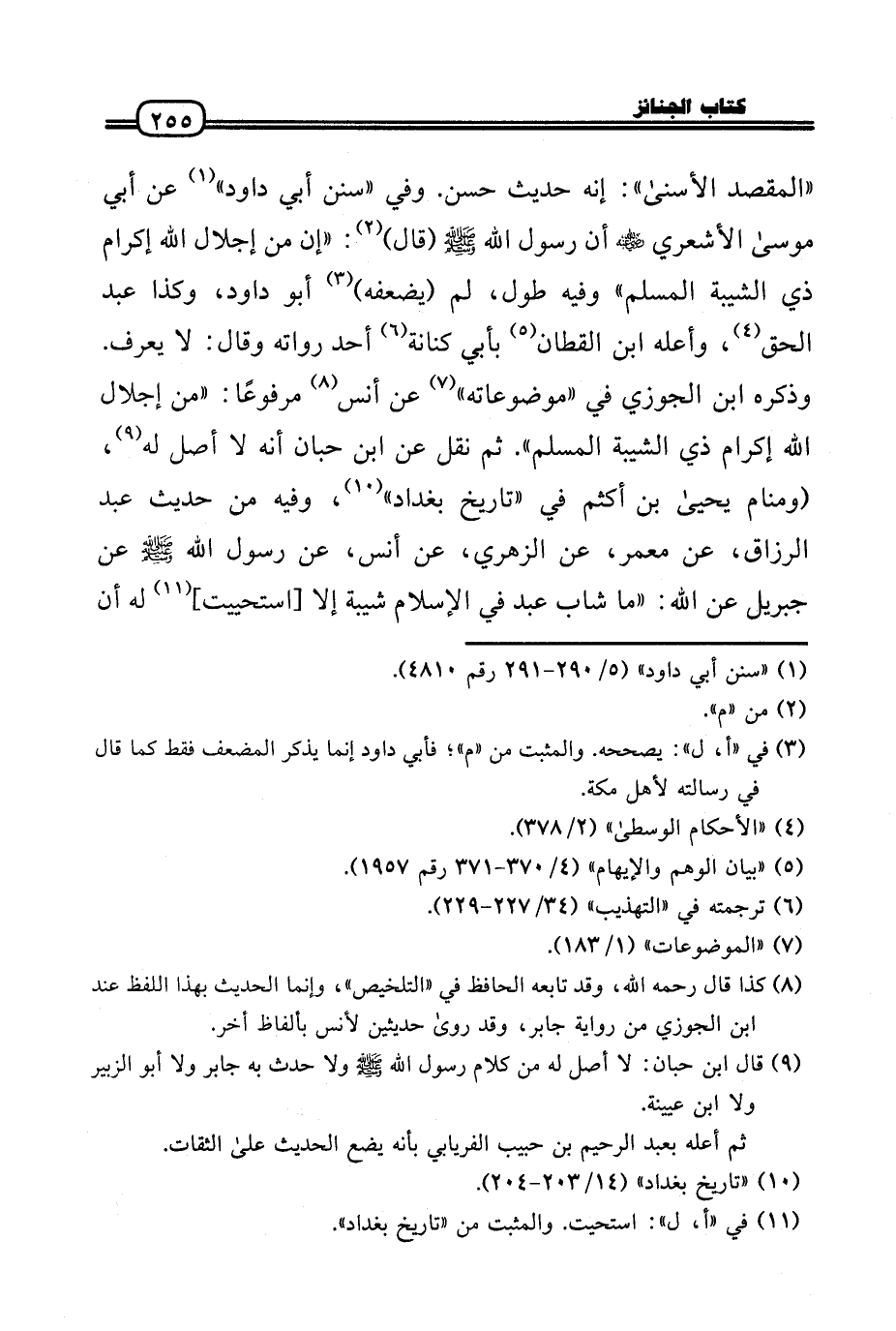 «الْمَقْصد الْأَسْنَى» : إِنَّه حَدِيث حسن. وَفِي «سنَن أبي دَاوُد» عَن أبي مُوسَى الْأَشْعَرِيّ رَضِيَ اللَّهُ عَنْه أَن رَسُول الله - صَلَّى الله عَلَيْهِ وَسلم - (قَالَ) : «إِن من إجلال الله إكرام ذِي الشيبة الْمُسلم» وَفِيه طول، لم (يُضعفهُ) أَبُو دَاوُد، وَكَذَا عبد الْحق، وَأعله ابْن الْقطَّان بِأبي كنَانَة أحد رُوَاته وَقَالَ: لَا يعرف. وَذكره ابْن الْجَوْزِيّ فِي «مَوْضُوعَاته» عَن أنس مَرْفُوعا: «من إجلال الله إكرام ذِي الشيبة الْمُسلم» . ثمَّ نقل عَن ابْن حبَان أَنه لَا أصل لَهُ، (ومنام يَحْيَى بن أَكْثَم فِي «تَارِيخ بَغْدَاد» ، وَفِيه من حَدِيث عبد الرَّزَّاق، عَن معمر، عَن الزُّهْرِيّ، عَن أنس، عَن رَسُول الله - صَلَّى الله عَلَيْهِ وَسلم - عَن جِبْرِيل عَن الله: «مَا شَاب عبد فِي الْإِسْلَام شيبَة إِلَّا [استحييت] لَهُ أَن