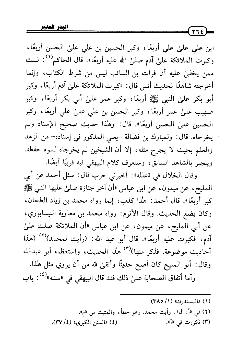 بن عَلّي عَلَى عَلّي أَرْبعا، وَكبر الْحُسَيْن بن عَلّي عَلَى الْحسن أَرْبعا، وَكَبرت الْمَلَائِكَة عَلَى آدم صَلَّى الله عَلَيْهِ أَرْبعا» . قَالَ الْحَاكِم: لست مِمَّن يخْفَى عَلَيْهِ أَن فرات بن السَّائِب لَيْسَ من شَرط الْكتاب، وَإِنَّمَا أخرجته شَاهدا لحَدِيث أنس قَالَ: «كَبرت الْمَلَائِكَة عَلَى آدم أَرْبعا، وَكبر أَبُو بكر عَلَى النَّبِي - صَلَّى الله عَلَيْهِ وَسلم - أَرْبعا، وَكبر عمر عَلَى أبي بكر أَرْبعا، وَكبر صُهَيْب عَلَى عمر أَرْبعا، وَكبر الْحسن بن عَلّي عَلَى عَلّي أَرْبعا، وَكبر الْحُسَيْن عَلَى الْحسن أَرْبعا» . قَالَ: وَهَذَا حَدِيث صَحِيح الْإِسْنَاد وَلم يخرجَاهُ. قَالَ: ولمبارك بن فضَالة - يَعْنِي الْمَذْكُور فِي إِسْنَاده - من الزّهْد وَالْعلم بِحَيْثُ لَا يجرح مثله، إِلَّا أَن الشَّيْخَيْنِ لم يخرجَاهُ لسوء حفظه. وينجبر بِالشَّاهِدِ السَّابِق، وستعرف كَلَام الْبَيْهَقِيّ فِيهِ قَرِيبا أَيْضا.