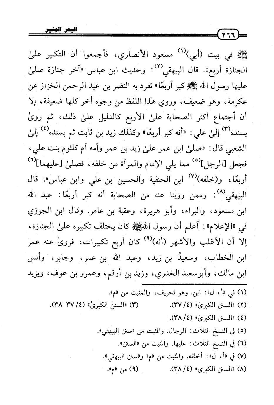 (فِي بَيت (أبي) مَسْعُود الْأنْصَارِيّ، فَأَجْمعُوا أَن التَّكْبِير عَلَى الْجِنَازَة أَربع» . قَالَ الْبَيْهَقِيّ: وَحَدِيث ابْن عَبَّاس «آخر جَنَازَة صَلَّى عَلَيْهَا رَسُول الله - صَلَّى الله عَلَيْهِ وَسلم - كبر أَرْبعا» تفرد بِهِ النَّضر بن عبد الرَّحْمَن الخزاز عَن عِكْرِمَة، وَهُوَ ضَعِيف، وَرُوِيَ هَذَا اللَّفْظ من وُجُوه أخر كلهَا ضَعِيفَة، إِلَّا أَن اجْتِمَاع أَكثر الصَّحَابَة عَلَى الْأَرْبَع كالدليل عَلَى ذَلِك، ثمَّ رَوَى بِسَنَدِهِ إِلَى عَلّي: «أَنه كبر أَرْبعا» وَكَذَلِكَ زيد بن ثَابت ثمَّ بِسَنَدِهِ إِلَى الشّعبِيّ قَالَ: «صَلَّى ابْن عمر عَلَى زيد بن عمر وَأمه أم كُلْثُوم بنت عَلّي، فَجعل [الرجل] مِمَّا يَلِي الإِمَام وَالْمَرْأَة من خَلفه، فَصَلى [عَلَيْهِمَا] أَرْبعا، و (خَلفه) ابْن الْحَنَفِيَّة وَالْحُسَيْن بن عَلّي وَابْن عَبَّاس» . قَالَ الْبَيْهَقِيّ: وَمِمَّنْ روينَا عَنهُ من الصَّحَابَة أَنه كبر أَرْبعا: عبد الله بن مَسْعُود، والبراء، وَأَبُو هُرَيْرَة، وَعقبَة بن عَامر. وَقَالَ ابْن الْجَوْزِيّ فِي «الْإِعْلَام» : اعْلَم أَن رَسُول الله - صَلَّى الله عَلَيْهِ وَسلم - كَانَ يخْتَلف تكبيره عَلَى الْجِنَازَة، إِلَّا أَن الْأَغْلَب وَالْأَشْهر (أَنه) كَانَ أَربع تَكْبِيرَات، فروَى عَنهُ عمر بن الْخطاب، وسعيدُ بن زيد، وَعبد الله بن عمر، وَجَابِر، وَأنس بن مَالك، وَأَبُو سعيد الْخُدْرِيّ، وَزيد بن أَرقم، وَعَمْرو بن عَوْف، وَيزِيد