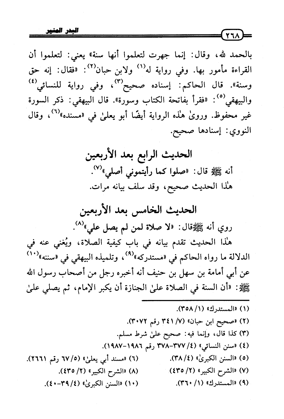 بِالْحَمْد لله، وَقَالَ: إِنَّمَا جهرت لِتَعْلَمُوا أَنَّهَا سنة» يَعْنِي: لِتَعْلَمُوا أَن الْقِرَاءَة مَأْمُور بهَا. وَفِي رِوَايَة لَهُ وَلابْن حبَان: «فَقَالَ: إِنَّه حق وَسنة» . قَالَ الْحَاكِم: إِسْنَاده صَحِيح، وَفِي رِوَايَة للنسائي وَالْبَيْهَقِيّ: «فَقَرَأَ بِفَاتِحَة الْكتاب وَسورَة» . قَالَ الْبَيْهَقِيّ: ذكر السُّورَة غير مَحْفُوظ. وَرَوَى هَذِه الرِّوَايَة أَيْضا أَبُو يعْلى فِي «مُسْنده» ، وَقَالَ النَّوَوِيّ: إسنادها صَحِيح.