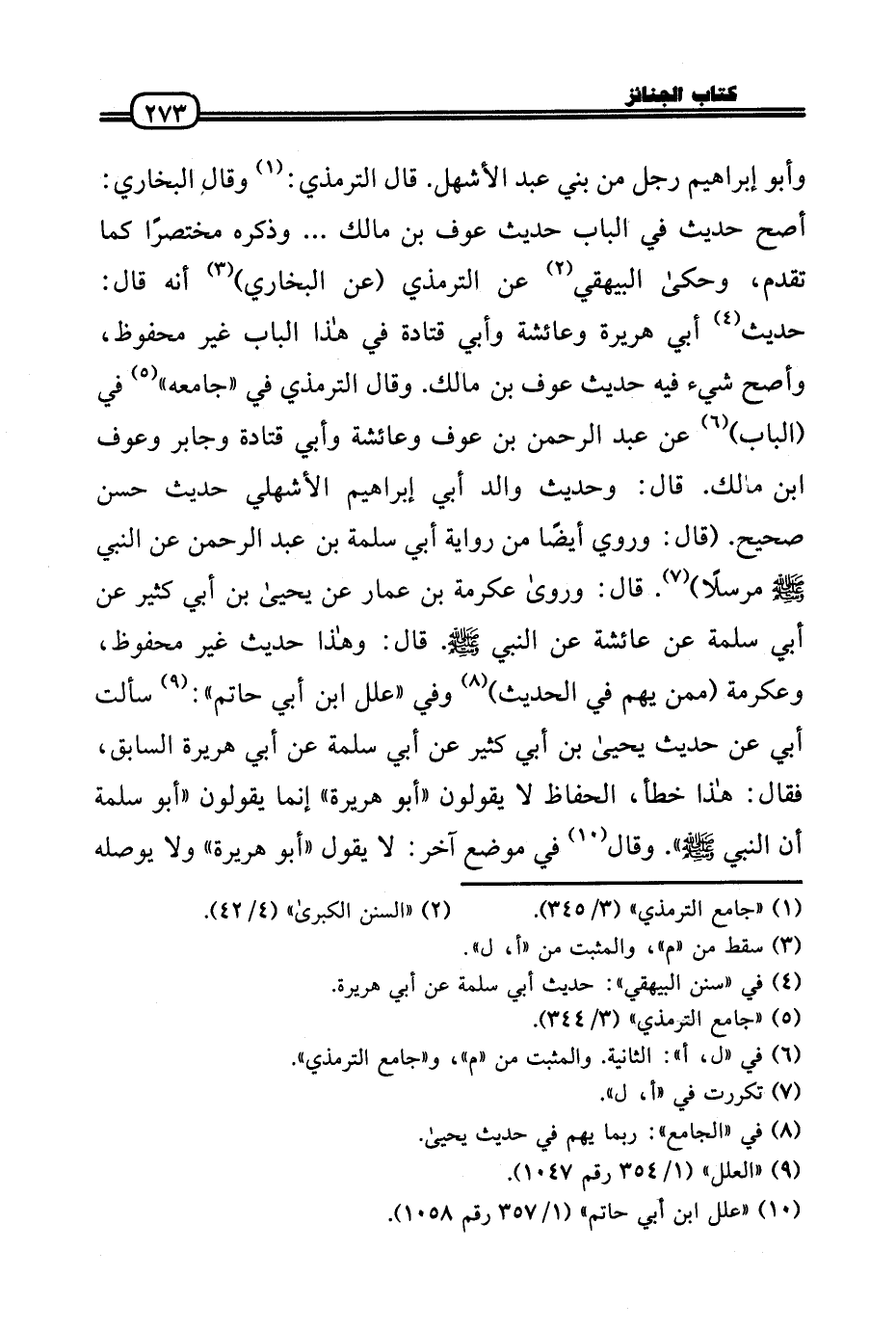 وَأَبُو إِبْرَاهِيم رجل من بني عبد الْأَشْهَل. قَالَ التِّرْمِذِيّ: وَقَالَ البُخَارِيّ: أصح حَدِيث فِي الْبَاب حَدِيث عَوْف بن مَالك ... وَذكره مُخْتَصرا كَمَا تقدم، وَحَكَى الْبَيْهَقِيّ عَن التِّرْمِذِيّ (عَن البُخَارِيّ) أَنه قَالَ: حَدِيث أبي هُرَيْرَة وَعَائِشَة وَأبي قَتَادَة فِي هَذَا الْبَاب غير مَحْفُوظ، وَأَصَح شَيْء فِيهِ حَدِيث عَوْف بن مَالك. وَقَالَ التِّرْمِذِيّ فِي «جَامعه» فِي (الْبَاب) عَن عبد الرَّحْمَن بن عَوْف وَعَائِشَة وَأبي قَتَادَة وَجَابِر وعَوْف بن مَالك. قَالَ: وَحَدِيث وَالِد أبي إِبْرَاهِيم الأشْهَلِي حَدِيث حسن صَحِيح. (قَالَ: وَرُوِيَ أَيْضا من رِوَايَة أبي سَلمَة بن عبد الرَّحْمَن عَن النَّبِي - صَلَّى الله عَلَيْهِ وَسلم - مُرْسلا) . قَالَ: وَرَوَى عِكْرِمَة بن عمار عَن يَحْيَى بن أبي كثير عَن أبي سَلمَة عَن عَائِشَة عَن النَّبِي - صَلَّى الله عَلَيْهِ وَسلم -. قَالَ: وَهَذَا حَدِيث غير مَحْفُوظ، وَعِكْرِمَة (مِمَّن يهم فِي الحَدِيث) وَفِي «علل ابْن أبي حَاتِم» : سَأَلت أبي عَن حَدِيث يَحْيَى بن أبي كثير عَن أبي سَلمَة عَن أبي هُرَيْرَة السَّابِق، فَقَالَ: هَذَا خطأ، الْحفاظ لَا يَقُولُونَ «أَبُو هُرَيْرَة» إِنَّمَا يَقُولُونَ «أَبُو سَلمَة أَن النَّبِي - صَلَّى الله عَلَيْهِ وَسلم -» . وَقَالَ فِي مَوضِع آخر: لَا يَقُول «أَبُو هُرَيْرَة» وَلَا يوصله