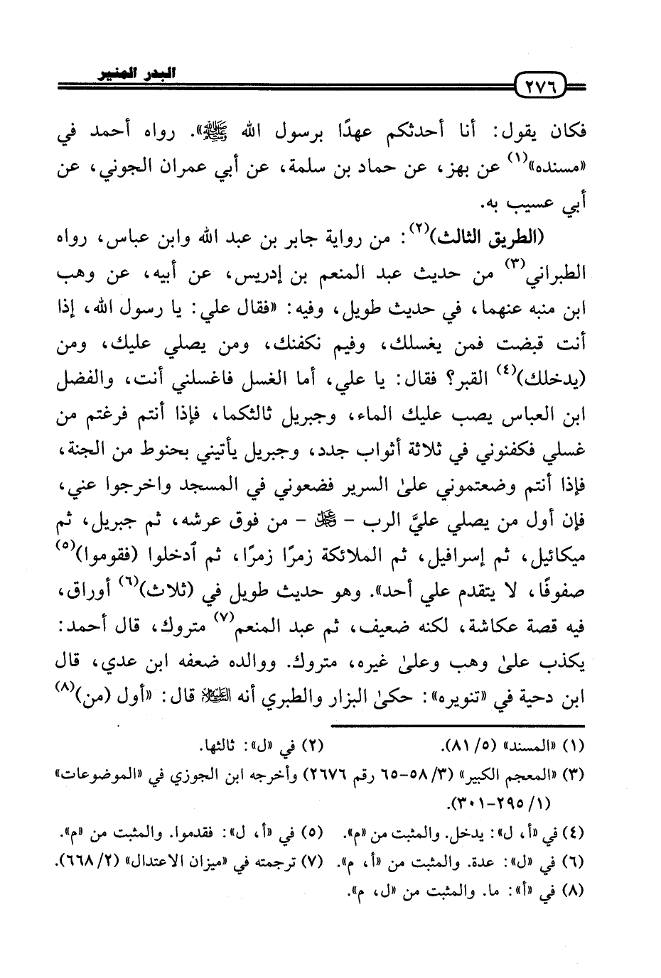 (الطَّرِيق الثَّالِث) : من رِوَايَة جَابر بن عبد الله وَابْن عَبَّاس، رَوَاهُ الطَّبَرَانِيّ من حَدِيث عبد الْمُنعم بن إِدْرِيس، عَن أَبِيه، عَن وهب بن مُنَبّه عَنْهُمَا، فِي حَدِيث طَوِيل، وَفِيه: «فَقَالَ عَلّي: يَا رَسُول الله، إِذا أَنْت قبضت فَمن يغسلك، وفيم نكفنك، وَمن يُصَلِّي عَلَيْك، وَمن (يدْخلك) الْقَبْر؟ فَقَالَ: يَا عَلّي، أما الْغسْل فاغسلني أَنْت، وَالْفضل بن الْعَبَّاس يصب عَلَيْك المَاء، وَجِبْرِيل ثالثكما، فَإِذا أَنْتُم فَرَغْتُمْ من غسْلي فكفنوني فِي ثَلَاثَة أَثوَاب جدد، وَجِبْرِيل يأتيني بحنوط من الْجنَّة، فَإِذا أَنْتُم وضعتموني عَلَى السرير فضعوني فِي الْمَسْجِد واخرجوا عني، فَإِن أول من يُصَلِّي عليَّ الرب - عَزَّ وَجَلَّ - من فَوق عَرْشه، ثمَّ جِبْرِيل، ثمَّ مِيكَائِيل، ثمَّ إسْرَافيل، ثمَّ الْمَلَائِكَة زمرًا زمرًا، ثمَّ ادخُلُوا (فَقومُوا) صُفُوفا، لَا يتَقَدَّم عَلّي أحد» . وَهُوَ حَدِيث طَوِيل فِي (ثَلَاث) أوراق، فِيهِ قصَّة عكاشة، لكنه ضَعِيف، ثمَّ عبد الْمُنعم مَتْرُوك، قَالَ أَحْمد: يكذب عَلَى وهب وَعَلَى غَيره، مَتْرُوك. ووالده ضعفه ابْن عدي، قَالَ ابْن دحْيَة فِي «تنويره» : حَكَى الْبَزَّار والطبري أَنه عَلَيْهِ السَّلَام قَالَ: «أول (من)