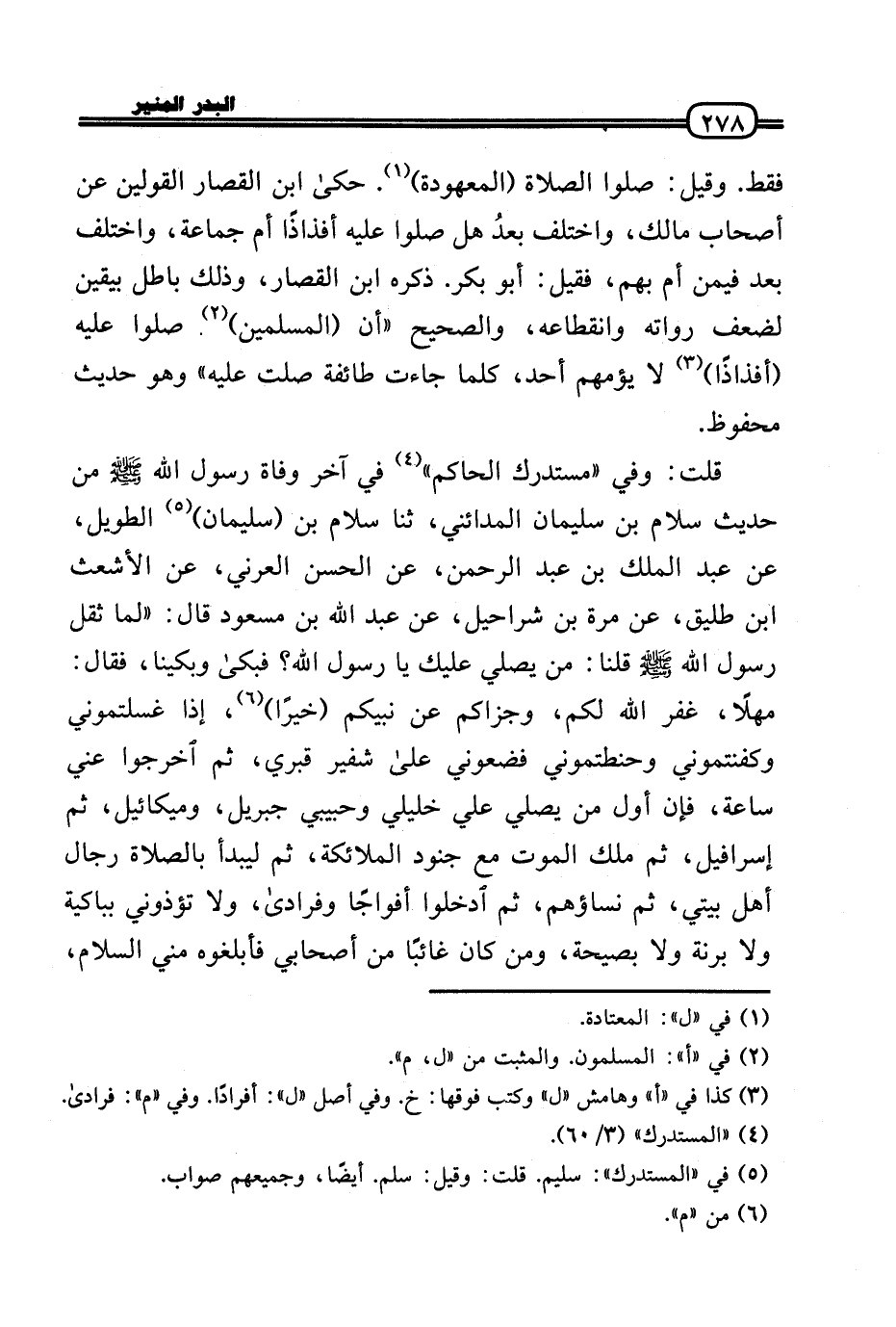 قلت: وَفِي «مُسْتَدْرك الْحَاكِم» فِي آخر وَفَاة رَسُول الله - صَلَّى الله عَلَيْهِ وَسلم - من حَدِيث سَلام بن سُلَيْمَان الْمَدَائِنِي، ثَنَا سَلام بن (سُلَيْمَان) الطَّوِيل، عَن عبد الْملك بن عبد الرَّحْمَن، عَن الْحسن العرني، عَن الْأَشْعَث بن طليق، عَن مرّة بن شرَاحِيل، عَن عبد الله بن مَسْعُود قَالَ: «لما ثقل رَسُول الله - صَلَّى الله عَلَيْهِ وَسلم - قُلْنَا: من يُصَلِّي عَلَيْك يَا رَسُول الله؟ فَبَكَى وبكينا، فَقَالَ: مهلا، غفر الله لكم، وجزاكم عَن نَبِيكُم (خيرا) ، إِذا غسلتموني وكفنتموني وحنطتموني فضعوني عَلَى شَفير قَبْرِي، ثمَّ اخْرُجُوا عني سَاعَة، فَإِن أول من يُصَلِّي عَلّي خليلي وحبيبي جِبْرِيل، وَمِيكَائِيل، ثمَّ إسْرَافيل، ثمَّ ملك الْمَوْت مَعَ جنود الْمَلَائِكَة، ثمَّ ليبدأ بِالصَّلَاةِ رجال أهل بَيْتِي، ثمَّ نِسَاؤُهُم، ثمَّ ادخُلُوا أَفْوَاجًا وفرادى، وَلَا تؤذوني بباكية وَلَا برنة وَلَا بصيحة، وَمن كَانَ غَائِبا من أَصْحَابِي فأبلغوه مني السَّلَام،