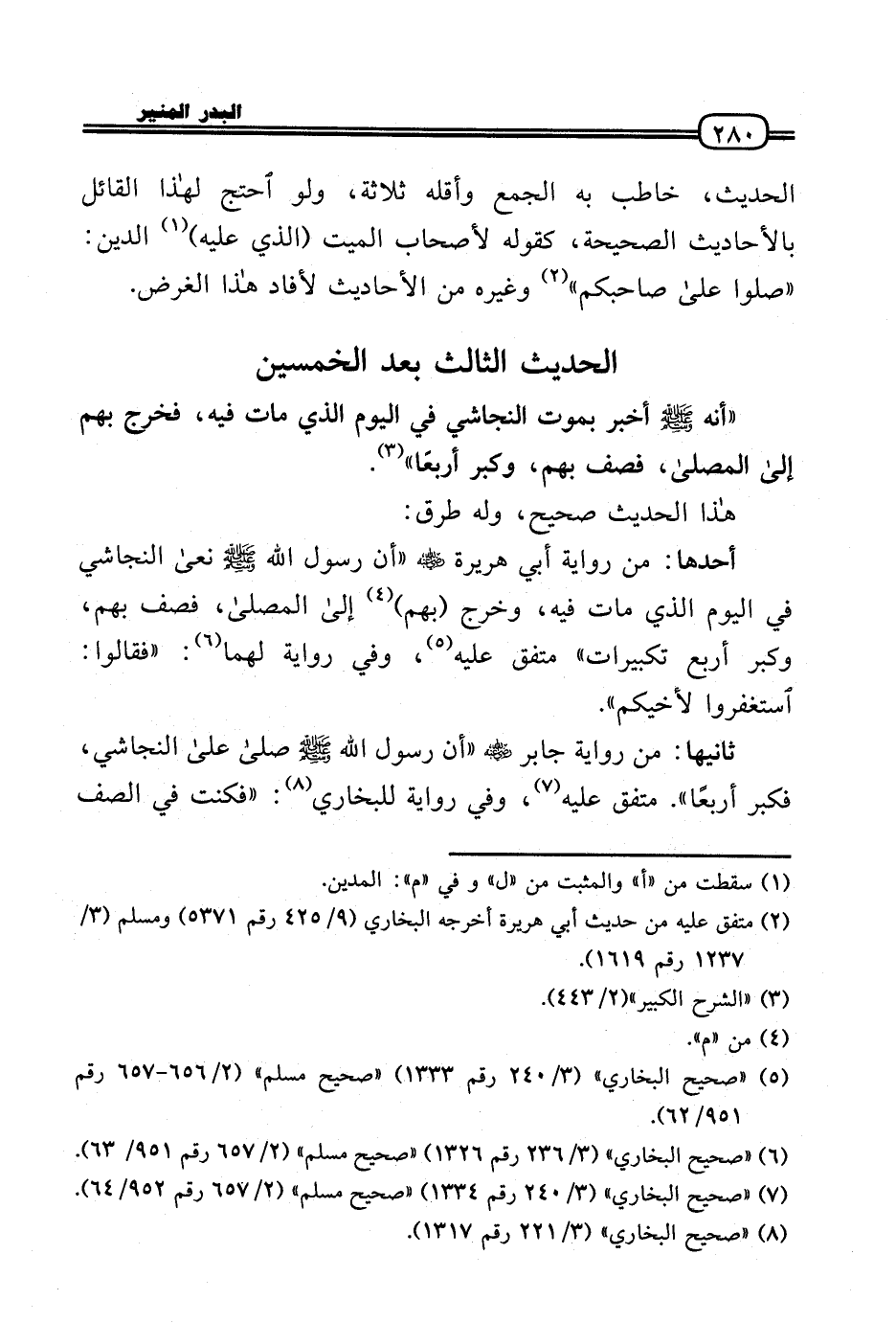 ثَانِيهَا: من رِوَايَة جَابر رَضِيَ اللَّهُ عَنْه «أَن رَسُول الله - صَلَّى الله عَلَيْهِ وَسلم - صَلَّى عَلَى النَّجَاشِيّ، فَكبر أَرْبعا» . مُتَّفق عَلَيْهِ، وَفِي رِوَايَة للْبُخَارِيّ: «فَكنت فِي الصَّفّ
