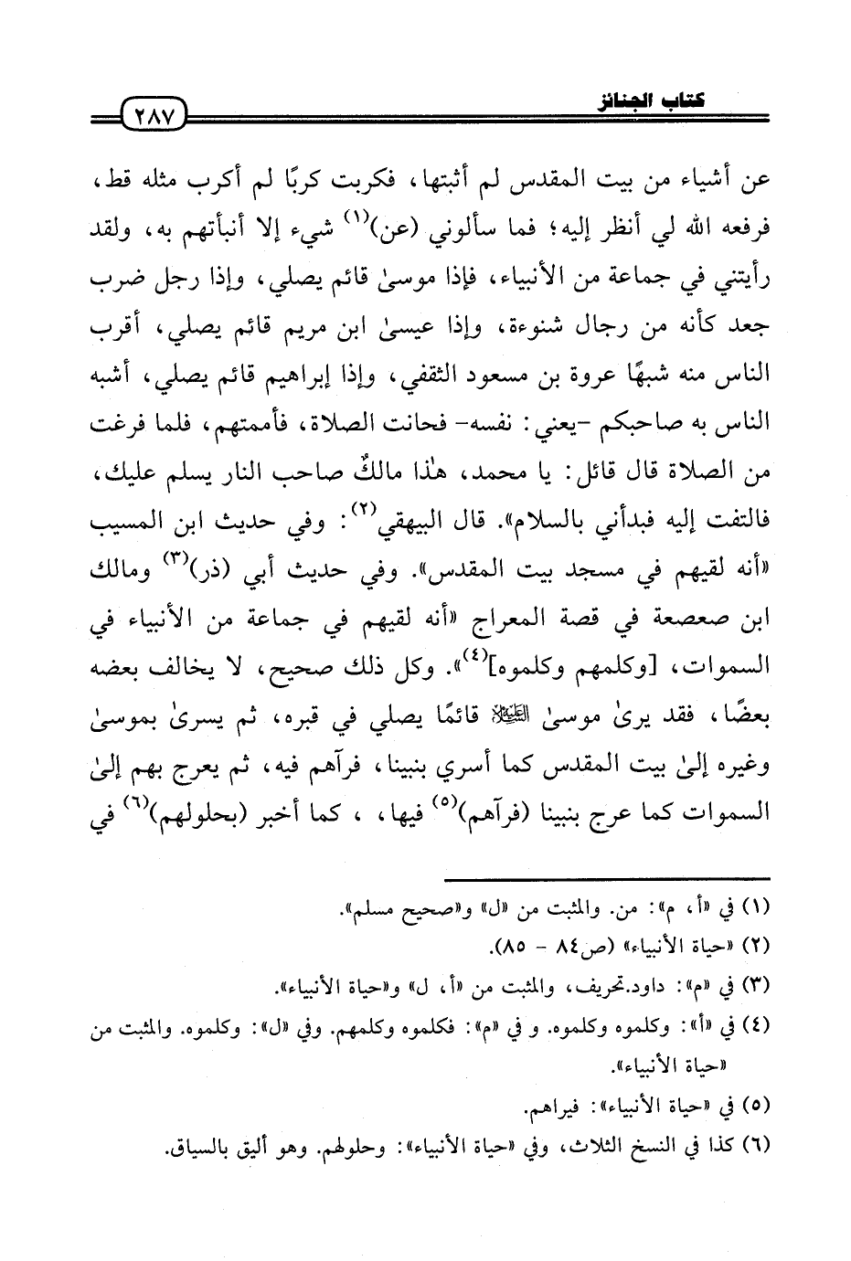 عَن أَشْيَاء من بَيت الْمُقَدّس لم أثبتها، فكربت كربًا لم أكرب مثله قطّ، فرفعه الله لي أنظر إِلَيْهِ؛ فَمَا سَأَلُونِي (عَن) شَيْء إِلَّا أنبأتهم بِهِ، وَلَقَد رَأَيْتنِي فِي جمَاعَة من الْأَنْبِيَاء، فَإِذا مُوسَى قَائِم يُصَلِّي، وَإِذا رجل ضرب جعد كَأَنَّهُ من رجال شنُوءَة، وَإِذا عِيسَى ابْن مَرْيَم قَائِم يُصَلِّي، أقرب النَّاس مِنْهُ شبها عُرْوَة بن مَسْعُود الثَّقَفِيّ، وَإِذا إِبْرَاهِيم قَائِم يُصَلِّي، أشبه النَّاس بِهِ صَاحبكُم - يَعْنِي: نَفسه - فحانت الصَّلَاة، فأممتهم، فَلَمَّا فرغت من الصَّلَاة قَالَ قَائِل: يَا مُحَمَّد، هَذَا مالكٌ صَاحب النَّار يسلم عَلَيْك، فَالْتَفت إِلَيْهِ فبدأني بِالسَّلَامِ» . قَالَ الْبَيْهَقِيّ: وَفِي حَدِيث ابْن الْمسيب «أَنه لَقِيَهُمْ فِي مَسْجِد بَيت الْمُقَدّس» . وَفِي حَدِيث أبي (ذَر) وَمَالك بن صعصعة فِي قصَّة الْمِعْرَاج «أَنه لَقِيَهُمْ فِي جمَاعَة من الْأَنْبِيَاء فِي السَّمَوَات، [وكلمهم وكلموه] ) . وكل ذَلِك صَحِيح، لَا يُخَالف بعضه بَعْضًا، فقد يرَى مُوسَى عَلَيْهِ السَّلَام قَائِما يُصَلِّي فِي قَبره، ثمَّ يُسرى بمُوسَى وَغَيره إِلَى بَيت الْمُقَدّس كَمَا أسرِي بنبينا، فَرَآهُمْ فِيهِ، ثمَّ يعرج بهم إِلَى السَّمَوَات كَمَا عرج بنبينا (فَرَآهُمْ) فِيهَا،، كَمَا أخبر (بحلولهم) فِي