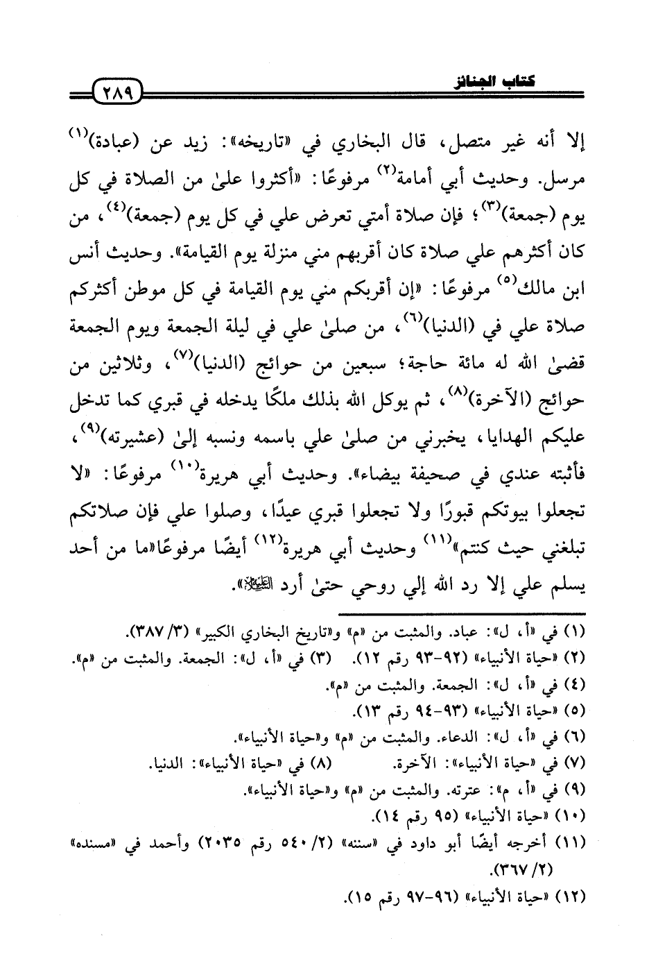 إِلَّا أَنه غير مُتَّصِل، قَالَ البُخَارِيّ فِي «تَارِيخه» : زيد عَن (عبَادَة) مُرْسل. وَحَدِيث أبي أُمَامَة مَرْفُوعا: «أَكْثرُوا عَلَى من الصَّلَاة فِي كل يَوْم (جُمُعَة) ؛ فَإِن صَلَاة أمتِي تعرض عَلّي فِي كل يَوْم (جُمُعَة) ، من كَانَ أَكْثَرهم عَلّي صَلَاة كَانَ أقربهم مني منزلَة يَوْم الْقِيَامَة» . وَحَدِيث أنس بن مَالك مَرْفُوعا: «إِن أقربكم مني يَوْم الْقِيَامَة فِي كل موطن أَكْثَرَكُم صَلَاة عَلّي فِي (الدُّنْيَا) ، من صَلَّى عَلّي فِي لَيْلَة الْجُمُعَة وَيَوْم الْجُمُعَة قَضَى الله لَهُ مائَة حَاجَة؛ سبعين من حوائج (الدُّنْيَا) ، وَثَلَاثِينَ من حوائج (الْآخِرَة) ، ثمَّ يُوكل الله بذلك ملكا يدْخلهُ فِي قَبْرِي كَمَا تدخل عَلَيْكُم الْهَدَايَا، يُخْبِرنِي من صَلَّى عَلّي باسمه وَنسبه إِلَى (عشيرته) ، فأثبته عِنْدِي فِي صحيفَة بَيْضَاء» . وَحَدِيث أبي هُرَيْرَة مَرْفُوعا: «لَا تجْعَلُوا بُيُوتكُمْ قبورًا وَلَا تجْعَلُوا قَبْرِي عيدًا، وصلوا عَلّي فَإِن صَلَاتكُمْ تبلغني حَيْثُ كُنْتُم» وَحَدِيث أبي هُرَيْرَة أَيْضا مَرْفُوعا «مَا من أحد يسلم عَلّي إِلَّا رد الله إِلَيّ روحي حَتَّى أرد عَلَيْهِ السَّلَام» .