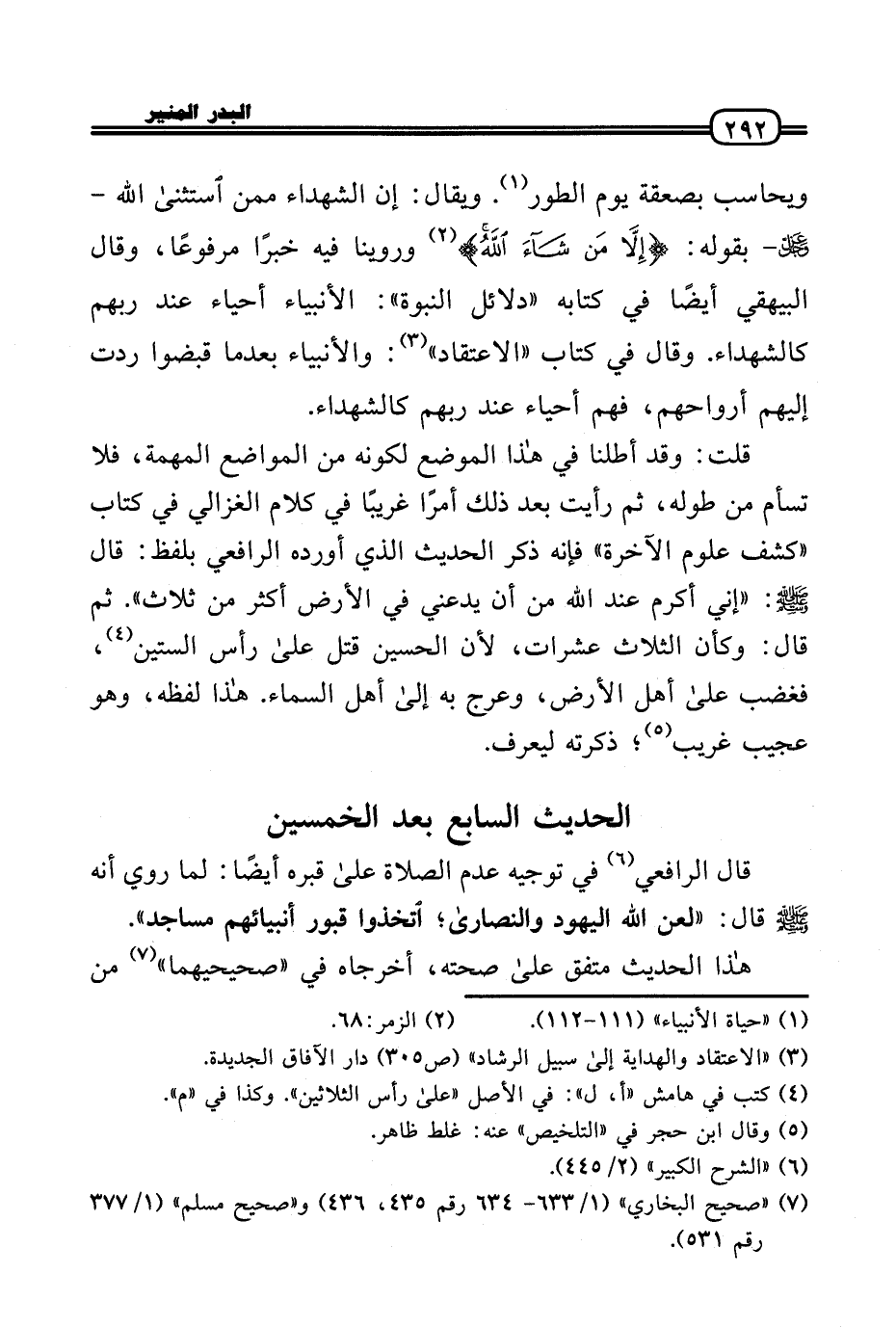 وَيُحَاسب بصعقة يَوْم الطّور. وَيُقَال: إِن الشُّهَدَاء مِمَّن اسْتثْنى الله - عَزَّ وَجَلَّ - بقوله: (إِلَّا مَنْ شَاءَ الله) وروينا فِيهِ خَبرا مَرْفُوعا، وَقَالَ الْبَيْهَقِيّ أَيْضا فِي كِتَابه «دَلَائِل النُّبُوَّة» : الْأَنْبِيَاء أَحيَاء عِنْد رَبهم كالشهداء. وَقَالَ فِي كتاب «الِاعْتِقَاد» : والأنبياء بَعْدَمَا قبضوا ردَّتْ إِلَيْهِم أَرْوَاحهم، فهم أَحيَاء عِنْد رَبهم كالشهداء.