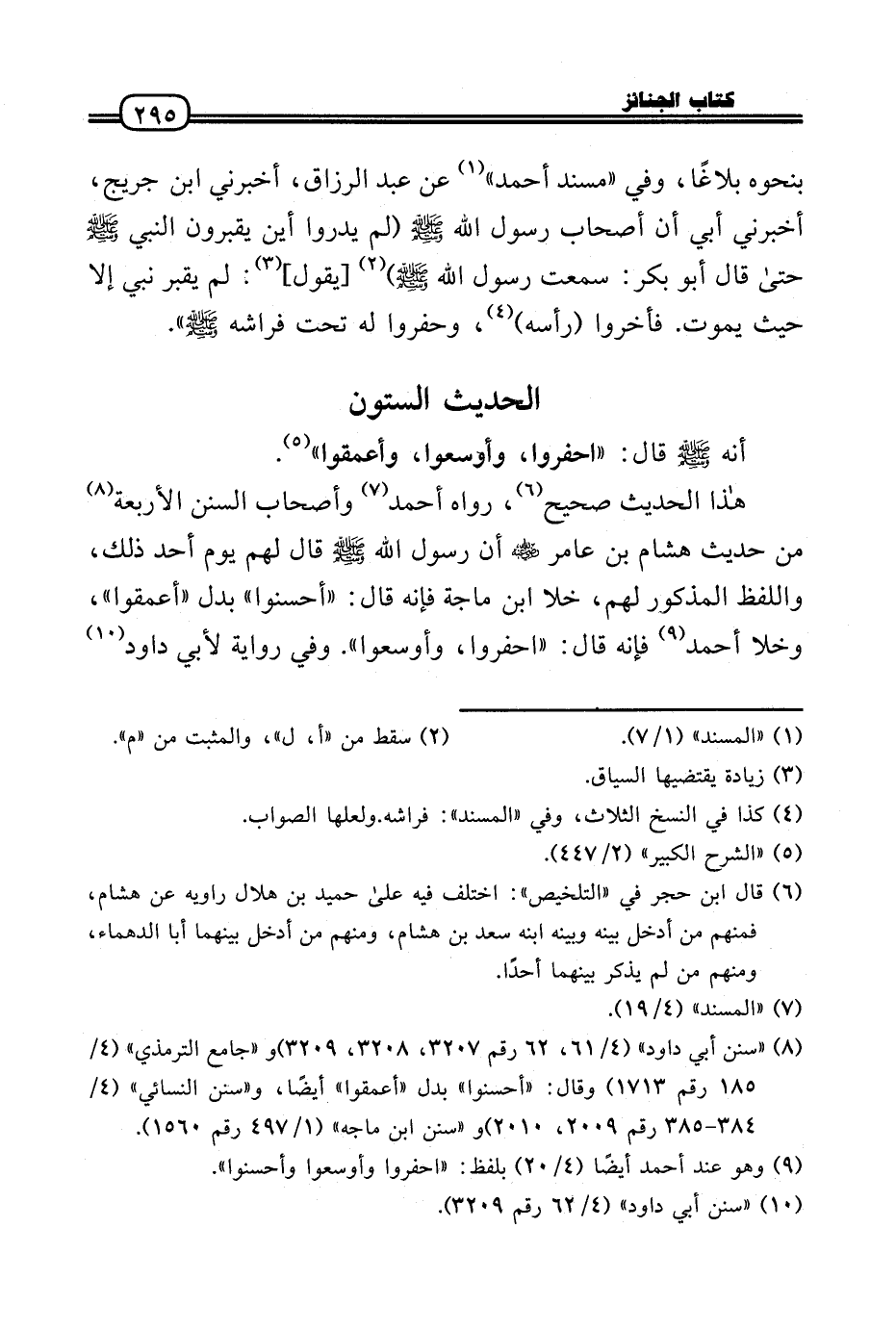 هَذَا الحَدِيث صَحِيح، رَوَاهُ أَحْمد وَأَصْحَاب السّنَن الْأَرْبَعَة من حَدِيث هِشَام بن عَامر رَضِيَ اللَّهُ عَنْه أَن رَسُول الله - صَلَّى الله عَلَيْهِ وَسلم - قَالَ لَهُم يَوْم أحد ذَلِك، وَاللَّفْظ الْمَذْكُور لَهُم، خلا ابْن ماجة فَإِنَّهُ قَالَ: «أَحْسنُوا» بدل «أعمقوا» ، وخلا أَحْمد فَإِنَّهُ قَالَ: «احفروا، وأوسعوا» . وَفِي رِوَايَة لأبي دَاوُد