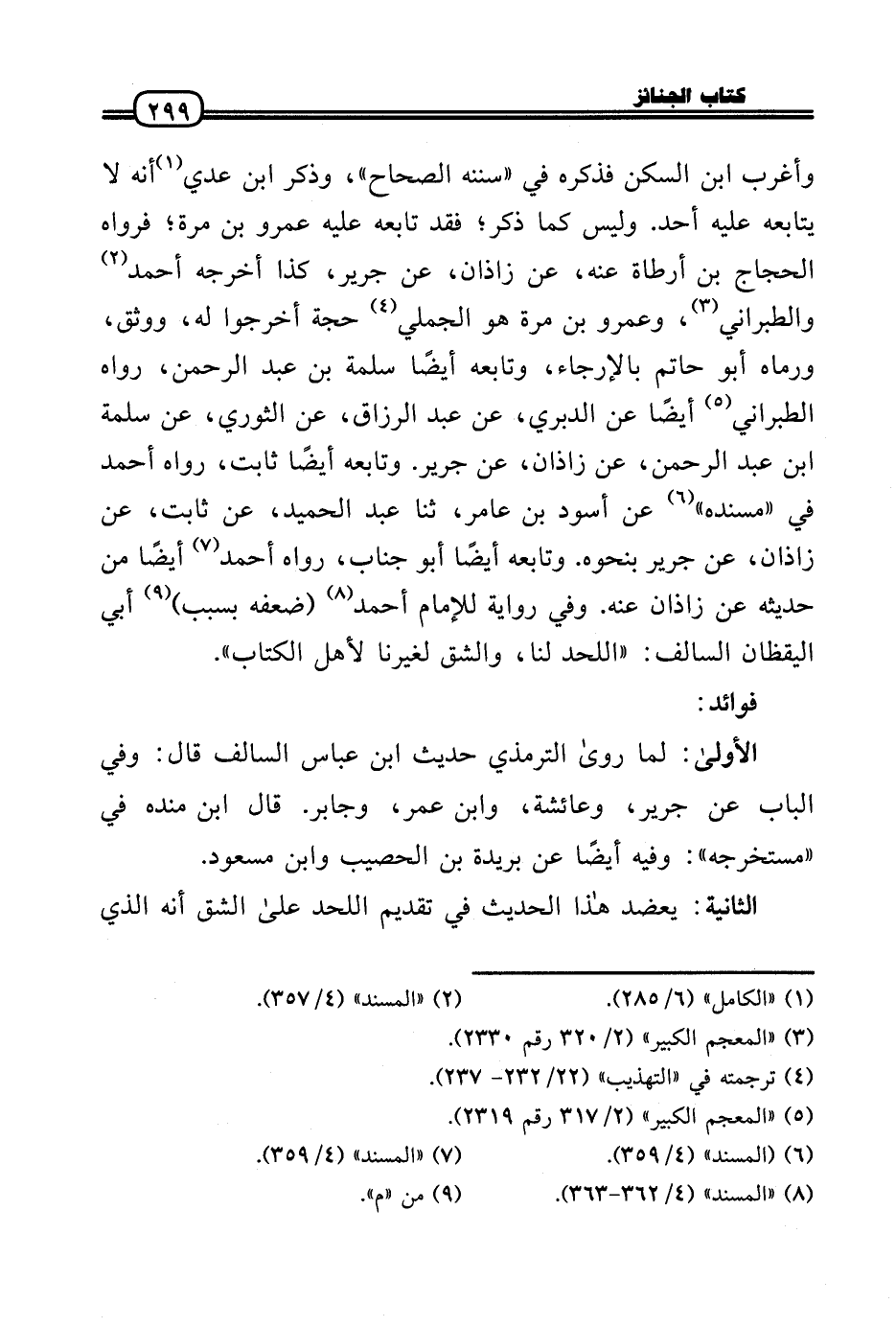 وَأغْرب ابْن السكن فَذكره فِي «سنَنه الصِّحَاح» ، وَذكر ابْن عدي أَنه لَا يُتَابِعه عَلَيْهِ أحد. وَلَيْسَ كَمَا ذكر؛ فقد تَابعه عَلَيْهِ عَمْرو بن مرّة؛ فَرَوَاهُ الْحجَّاج بن أَرْطَاة عَنهُ، عَن زَاذَان، عَن جرير، كَذَا أخرجه أَحْمد وَالطَّبَرَانِيّ، وَعَمْرو بن مرّة هُوَ الْجملِي حجَّة أخرجُوا لَهُ، ووثق، ورماه أَبُو حَاتِم بالإرجاء، وَتَابعه أَيْضا سَلمَة بن عبد الرَّحْمَن، رَوَاهُ الطَّبَرَانِيّ أَيْضا عَن الدبرِي، عَن عبد الرَّزَّاق، عَن الثَّوْريّ، عَن سَلمَة بن عبد الرَّحْمَن، عَن زَاذَان، عَن جرير. وَتَابعه أَيْضا ثَابت، رَوَاهُ أَحْمد فِي «مُسْنده» عَن أسود بن عَامر، ثَنَا عبد الحميد، عَن ثَابت، عَن زَاذَان، عَن جرير بِنَحْوِهِ. وَتَابعه أَيْضا أَبُو جناب، رَوَاهُ أَحْمد أَيْضا من حَدِيثه عَن زَاذَان عَنهُ. وَفِي رِوَايَة للْإِمَام أَحْمد (ضعفه بِسَبَب) أبي الْيَقظَان السالف: «اللَّحْد لنا، والشق لغيرنا لأهل الْكتاب» .