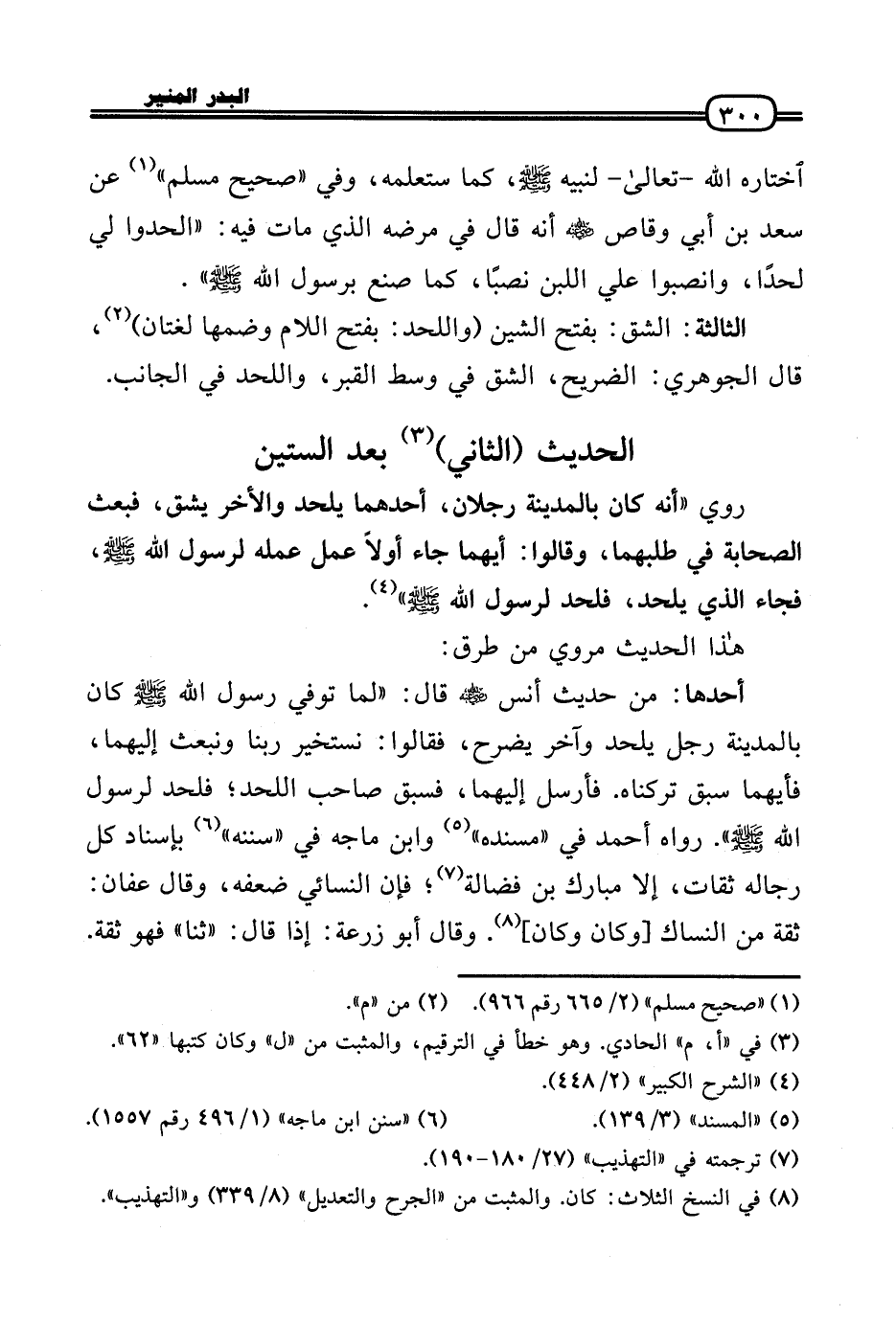 أَحدهَا: من حَدِيث أنس رَضِيَ اللَّهُ عَنْه قَالَ: «لما توفّي رَسُول الله - صَلَّى الله عَلَيْهِ وَسلم - كَانَ بِالْمَدِينَةِ رجل يلْحد وَآخر يضرح، فَقَالُوا: نستخير رَبنَا ونبعث إِلَيْهِمَا، فَأَيّهمَا سبق تَرَكْنَاهُ. فَأرْسل إِلَيْهِمَا، فَسبق صَاحب اللَّحْد؛ فلحد لرَسُول الله - صَلَّى الله عَلَيْهِ وَسلم -» . رَوَاهُ أَحْمد فِي «مُسْنده» وَابْن مَاجَه فِي «سنَنه» بِإِسْنَاد كل رِجَاله ثِقَات، إِلَّا مبارك بن فضَالة؛ فَإِن النَّسَائِيّ ضعفه، وَقَالَ عَفَّان: ثِقَة من النساك [وَكَانَ وَكَانَ] . وَقَالَ أَبُو زرْعَة: إِذا قَالَ: (ثَنَا) فَهُوَ ثِقَة.