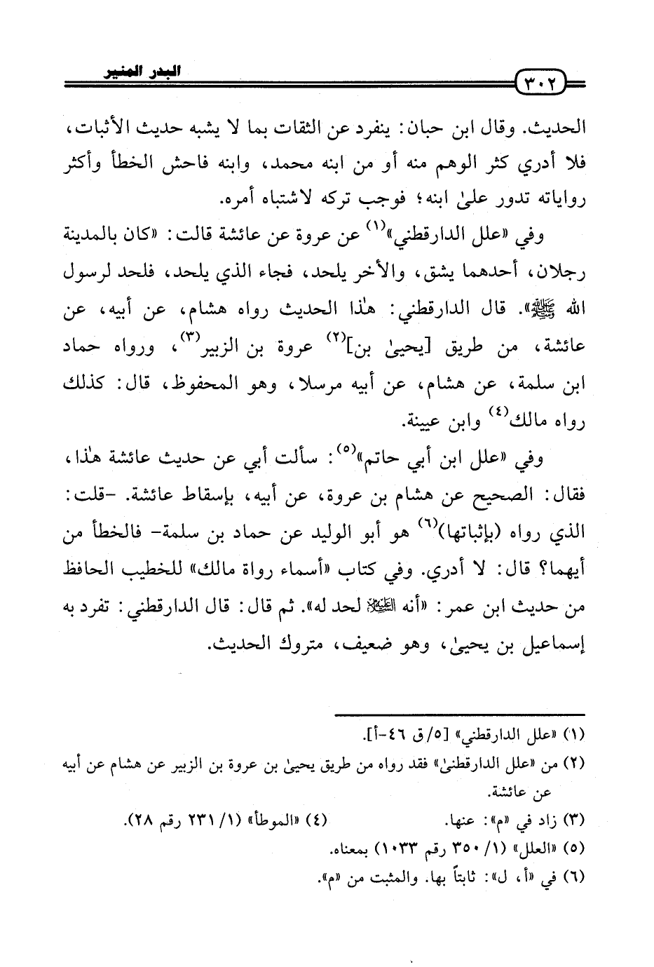 وَفِي «علل ابْن أبي حَاتِم» : سَأَلت أبي عَن حَدِيث عَائِشَة هَذَا، فَقَالَ: الصَّحِيح عَن هِشَام بن عُرْوَة، عَن أَبِيه، بِإِسْقَاط عَائِشَة. - قلت: الَّذِي رَوَاهُ (بإثباتها) هُوَ أَبُو الْوَلِيد عَن حَمَّاد بن سَلمَة - فالخطأ من أَيهمَا؟ قَالَ: لَا أَدْرِي. وَفِي كتاب «أَسمَاء رُوَاة مَالك» للخطيب الْحَافِظ من حَدِيث ابْن عمر: «أَنه عَلَيْهِ السَّلَام لحد لَهُ» . ثمَّ قَالَ: قَالَ الدَّارَقُطْنِيّ: تفرد بِهِ إِسْمَاعِيل بن يَحْيَى، وَهُوَ ضَعِيف، مَتْرُوك الحَدِيث.