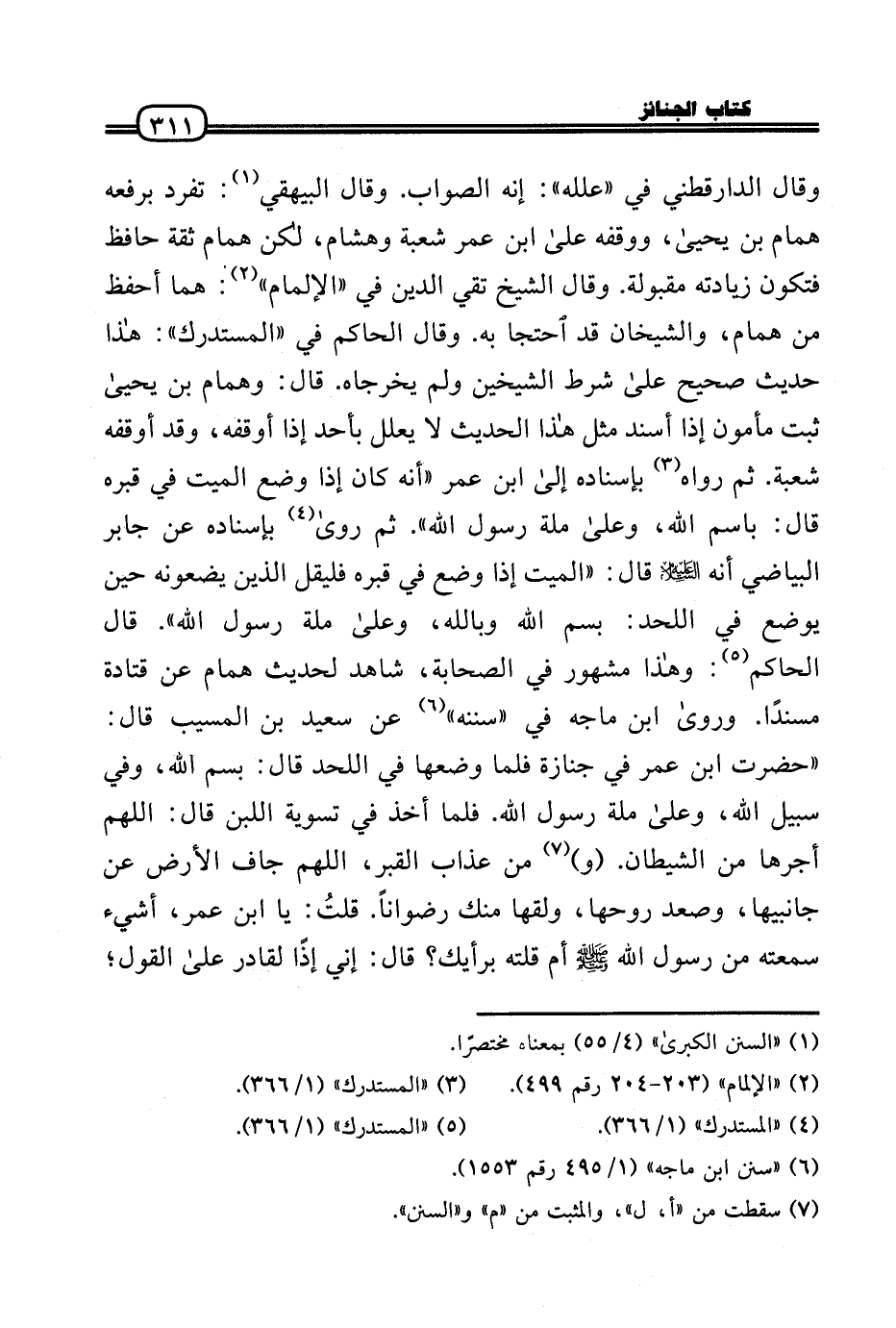 وَقَالَ الدَّارَقُطْنِيّ فِي «علله» : إِنَّه الصَّوَاب. وَقَالَ الْبَيْهَقِيّ: تفرد بِرَفْعِهِ همام بن يَحْيَى، وَوَقفه عَلَى ابْن عمر شُعْبَة وَهِشَام، لَكِن همام ثِقَة حَافظ فَتكون زِيَادَته مَقْبُولَة. وَقَالَ الشَّيْخ تَقِيّ الدَّين فِي (الْإِلْمَام) : هما أحفظ من همام، والشيخان قد احتجا بِهِ. وَقَالَ الْحَاكِم فِي «الْمُسْتَدْرك» : هَذَا حَدِيث صَحِيح عَلَى شَرط الشَّيْخَيْنِ وَلم يخرجَاهُ. قَالَ: وَهَمَّام بن يَحْيَى ثَبت مَأْمُون إِذا أسْند مثل هَذَا الحَدِيث لَا يُعلل بِأحد إِذا أوقفهُ، وَقد أوقفهُ شُعْبَة. ثمَّ رَوَاهُ بِإِسْنَادِهِ إِلَى ابْن عمر «أَنه كَانَ إِذا وضع الْمَيِّت فِي قَبره قَالَ: باسم الله، وَعَلَى مِلَّة رَسُول الله» . ثمَّ رَوَى بِإِسْنَادِهِ عَن جَابر البياضي أَنه عَلَيْهِ السَّلَام قَالَ: «الْمَيِّت إِذا وضع فِي قَبره فَلْيقل الَّذين يضعونه حِين يوضع فِي اللَّحْد: بِسم الله وَبِاللَّهِ، وَعَلَى مِلَّة رَسُول الله» . قَالَ الْحَاكِم: وَهَذَا مَشْهُور فِي الصَّحَابَة، شَاهد لحَدِيث همام عَن قَتَادَة مُسْندًا. وَرَوَى ابْن مَاجَه فِي «سنَنه» عَن سعيد بن الْمسيب قَالَ: «حضرت ابْن عمر فِي جَنَازَة فَلَمَّا وَضعهَا فِي اللَّحْد قَالَ: بِسم الله، وَفِي سَبِيل الله، وَعَلَى مِلَّة رَسُول الله. فَلَمَّا أَخذ فِي تَسْوِيَة اللَّبن قَالَ: اللَّهُمَّ أجرهَا من الشَّيْطَان. (و) من عَذَاب الْقَبْر، اللَّهُمَّ جَاف الأَرْض عَن جانبيها، وَصعد روحها، ولقها مِنْك رضواناً. قلتُ: يَا ابْن عمر، أَشَيْء سمعته من رَسُول الله - صَلَّى الله عَلَيْهِ وَسلم - أم قلته بِرَأْيِك؟ قَالَ: إِنِّي إِذا لقادر عَلَى القَوْل؛