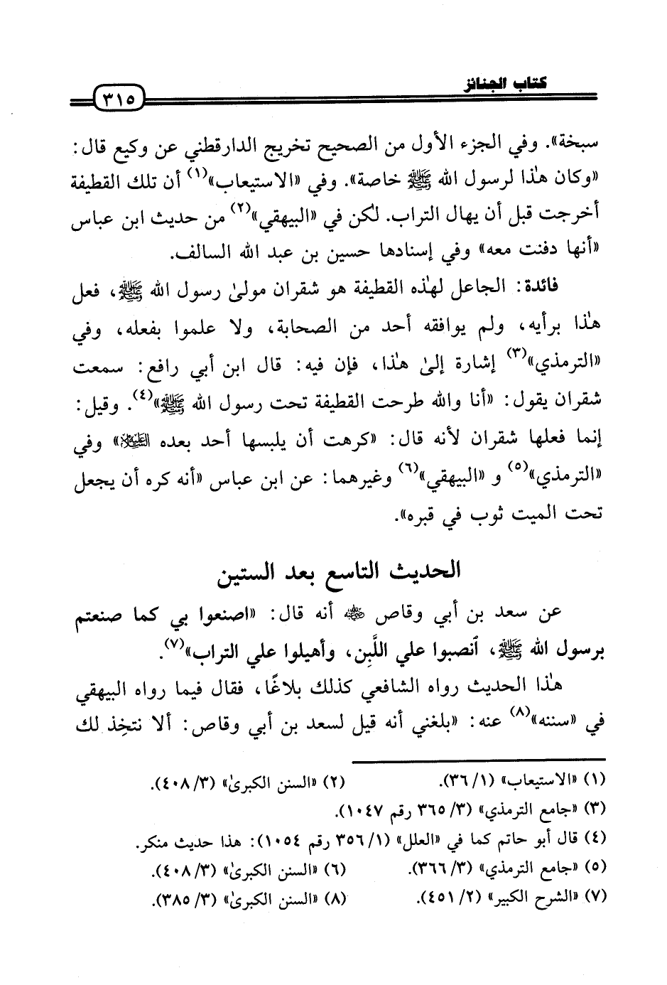 سبخَة» . وَفِي الْجُزْء الأول من الصَّحِيح تَخْرِيج الدَّارَقُطْنِيّ عَن وَكِيع قَالَ: «وَكَانَ هَذَا لرَسُول الله - صَلَّى الله عَلَيْهِ وَسلم - خَاصَّة» . وَفِي «الِاسْتِيعَاب» أَن تِلْكَ القطيفة أخرجت قبل أَن يهال التُّرَاب. لَكِن فِي «الْبَيْهَقِيّ» من حَدِيث ابْن عَبَّاس «أَنَّهَا دفنت مَعَه» وَفِي إسنادها حُسَيْن بن عبد الله السالف.