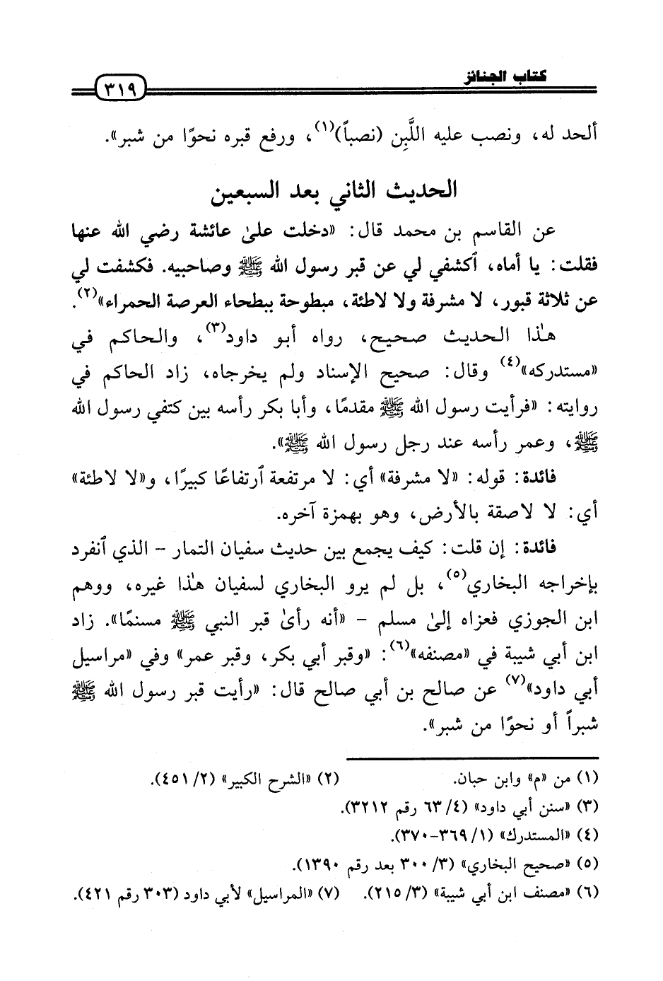 عَن الْقَاسِم بن مُحَمَّد قَالَ: «دخلت عَلَى عَائِشَة رَضِيَ اللَّهُ عَنْها فَقلت: يَا أُمَّاهُ، اكشفي لي عَن قبر رَسُول الله - صَلَّى الله عَلَيْهِ وَسلم - وصاحبيه. فَكشفت لي عَن ثَلَاثَة قُبُور، لَا مشرفة وَلَا لاطئة، مبطوحة ببطحاء الْعَرَصَة الْحَمْرَاء» .
