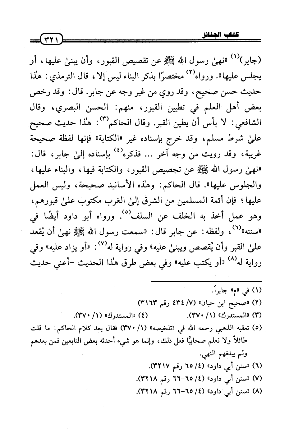 (جَابر) «نهَى رَسُول الله - صَلَّى الله عَلَيْهِ وَسلم - عَن تقصيص الْقُبُور، وَأَن يُبْنَى عَلَيْهَا، أَو يجلس عَلَيْهَا» . وَرَوَاهُ مُخْتَصرا بِذكر الْبناء لَيْسَ إِلَّا، قَالَ التِّرْمِذِيّ: هَذَا حَدِيث حسن صَحِيح، وَقد رُوِيَ من غير وَجه عَن جَابر. قَالَ: وَقد رخص بعض أهل الْعلم فِي تطيين الْقُبُور، مِنْهُم: الْحسن الْبَصْرِيّ، وَقَالَ الشَّافِعِي: لَا بَأْس أَن يطين الْقَبْر. وَقَالَ الْحَاكِم: هَذَا حَدِيث صَحِيح عَلَى شَرط مُسلم، وَقد خرج بِإِسْنَادِهِ غير «الْكِتَابَة» فَإِنَّهَا لَفْظَة صَحِيحَة غَرِيبَة، وَقد رويت من وَجه آخر ... فَذكره بِإِسْنَادِهِ إِلَى جَابر، قَالَ: «نهَى رَسُول الله - صَلَّى الله عَلَيْهِ وَسلم - عَن تجصيص الْقُبُور، وَالْكِتَابَة فِيهَا، وَالْبناء عَلَيْهَا، وَالْجُلُوس عَلَيْهَا» . قَالَ الْحَاكِم: وَهَذِه الْأَسَانِيد صَحِيحَة، وَلَيْسَ الْعَمَل عَلَيْهَا؛ فَإِن أَئِمَّة الْمُسلمين من الشرق إِلَى الغرب مَكْتُوب عَلَى قُبُورهم، وَهُوَ عمل أَخذ بِهِ الْخلف عَن السّلف. وَرَوَاهُ أَبُو دَاوُد أَيْضا فِي «سنَنه» ، وَلَفظه: عَن جَابر قَالَ: «سَمِعت رَسُول الله - صَلَّى الله عَلَيْهِ وَسلم - نهَى أَن يْقعد عَلَى الْقَبْر وَأَن يُقصص ويبنى عَلَيْهِ» وَفِي رِوَايَة لَهُ: «أَو يُزَاد عَلَيْهِ» وَفِي رِوَايَة لَهُ «أَو يكْتب عَلَيْهِ» وَفِي بعض طرق هَذَا الحَدِيث - أَعنِي حَدِيث