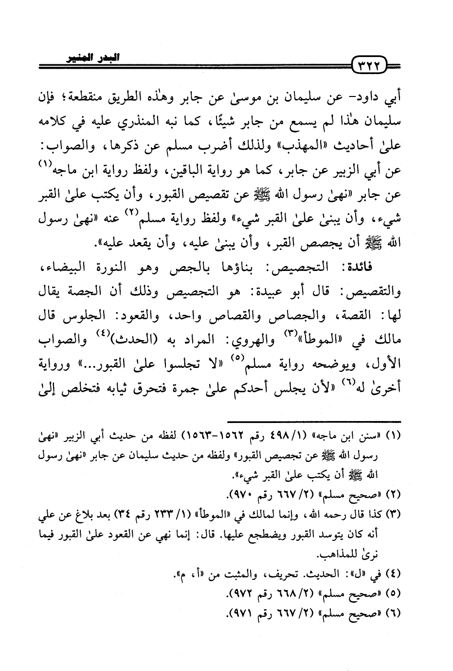أبي دَاوُد - عَن سُلَيْمَان بن مُوسَى عَن جَابر وَهَذِه الطَّرِيق مُنْقَطِعَة؛ فَإِن سُلَيْمَان هَذَا لم يسمع من جَابر شَيْئا، كَمَا نبه الْمُنْذِرِيّ عَلَيْهِ فِي كَلَامه عَلَى أَحَادِيث «الْمُهَذّب» وَلذَلِك أضْرب مُسلم عَن ذكرهَا، وَالصَّوَاب: عَن أبي الزبير عَن جَابر، كَمَا هُوَ رِوَايَة البَاقِينَ، وَلَفظ رِوَايَة ابْن مَاجَه عَن جَابر «نهَى رَسُول الله - صَلَّى الله عَلَيْهِ وَسلم - عَن تقصيص الْقُبُور، وَأَن يكْتب عَلَى الْقَبْر شَيْء، وَأَن يُبْنَى عَلَى الْقَبْر شَيْء» وَلَفظ رِوَايَة مُسلم عَنهُ «نهَى رَسُول الله - صَلَّى الله عَلَيْهِ وَسلم - أَن يجصص الْقَبْر، وَأَن يُبْنَى عَلَيْهِ، وَأَن يقْعد عَلَيْهِ» .