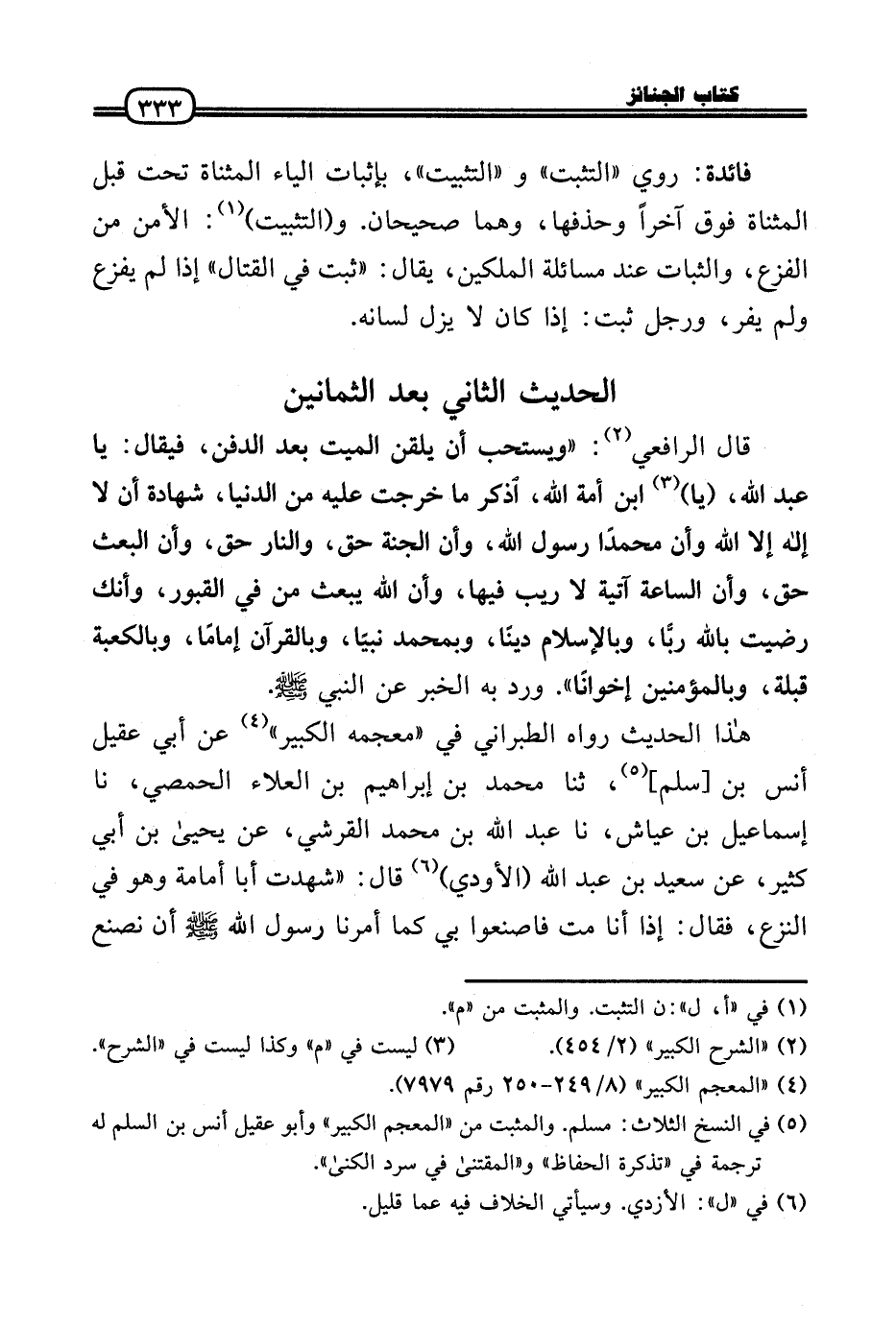 قَالَ الرَّافِعِيّ: «وَيسْتَحب أَن يلقن الْمَيِّت بعد الدّفن، فَيُقَال: يَا عبد الله، (يَا) ابْن أمة الله، اذكر مَا خرجت عَلَيْهِ من الدُّنْيَا، شَهَادَة أَن لَا إِلَه إِلَّا الله وَأَن مُحَمَّدًا رَسُول الله، وَأَن الْجنَّة حق، وَالنَّار حق، وَأَن الْبَعْث حق، وَأَن السَّاعَة آتِيَة لَا ريب فِيهَا، وَأَن الله يبْعَث من فِي الْقُبُور، وَأَنَّك رضيت بِاللَّه ربًّا، وَبِالْإِسْلَامِ دينا، وَبِمُحَمَّدٍ نَبيا، وَبِالْقُرْآنِ إِمَامًا، وَبِالْكَعْبَةِ قبْلَة، وَبِالْمُؤْمِنِينَ إخْوَانًا» . ورد بِهِ الْخَبَر عَن النَّبِي - صَلَّى الله عَلَيْهِ وَسلم -.