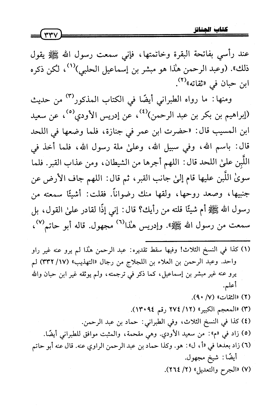 عِنْد رَأْسِي بِفَاتِحَة الْبَقَرَة وخاتمتها، فَإِنِّي سَمِعت رَسُول الله - صَلَّى الله عَلَيْهِ وَسلم - يَقُول ذَلِك» . (وَعبد الرَّحْمَن هَذَا هُوَ مُبشر بن إِسْمَاعِيل الْحلَبِي) ، لَكِن ذكره ابْن حبَان فِي «ثقاته» .
