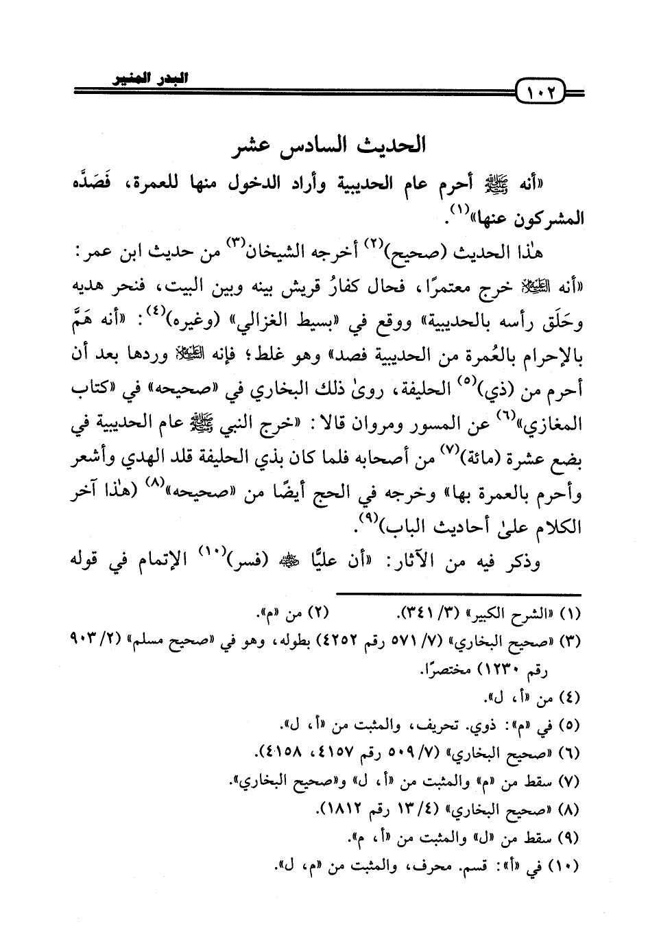 هَذَا الحَدِيث (صَحِيح) أخرجه الشَّيْخَانِ من حَدِيث ابْن عمر: «أَنه عَلَيْهِ السَّلَام خرج مُعْتَمِرًا، فحال كفارُ قُرَيْش بَينه وَبَين الْبَيْت، فَنحر هَدْيه وحَلَق رَأسه بِالْحُدَيْبِية» وَوَقع فِي «بسيط الْغَزالِيّ» (وَغَيره) : «أَنه هَمَّ بِالْإِحْرَامِ بالعُمرة من الْحُدَيْبِيَة فصد» وَهُوَ غلط؛ فَإِنَّهُ عَلَيْهِ السَّلَام وردهَا بعد أَن أحرم من (ذِي) الحليفة، رَوَى ذَلِك البُخَارِيّ فِي «صَحِيحه» فِي «كتاب الْمَغَازِي» عَن الْمسور ومروان قَالَا: «خرج النَّبِي - صَلَّى الله عَلَيْهِ وَسلم - عَام الْحُدَيْبِيَة فِي بضع عشرَة (مائَة) من أَصْحَابه فَلَمَّا كَانَ بِذِي الحليفة قلد الْهَدْي وأشعر وَأحرم بِالْعُمْرَةِ بهَا» وخرجه فِي الْحَج أَيْضا من «صَحِيحه» (هَذَا آخر الْكَلَام عَلَى أَحَادِيث الْبَاب) .