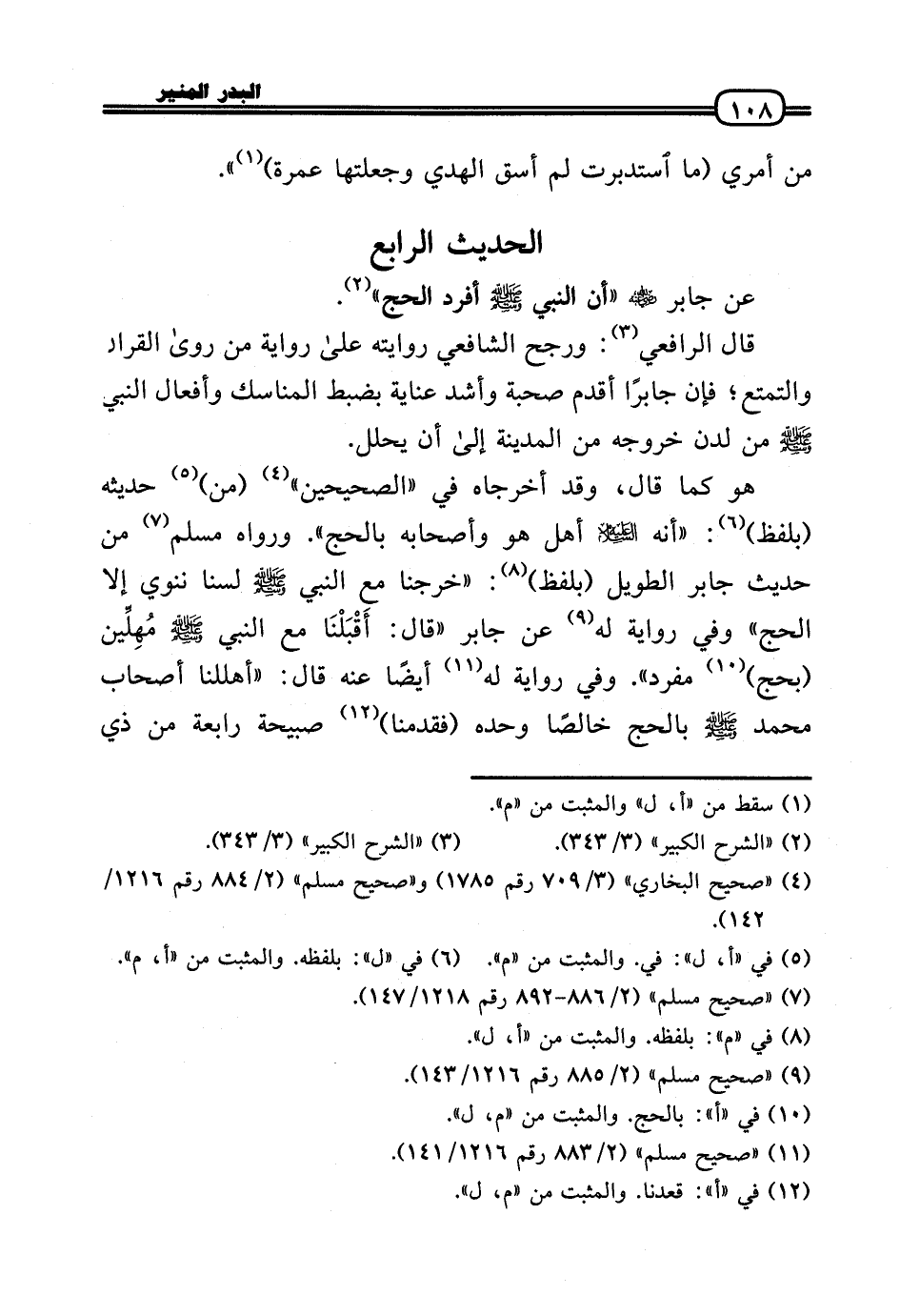 قَالَ الرَّافِعِيّ: وَرجح الشَّافِعِي رِوَايَته عَلَى رِوَايَة من رَوَى الْقرَان والتمتع؛ فَإِن جَابِرا أقدم صُحْبَة وَأَشد عناية بضبط الْمَنَاسِك وأفعال النَّبِي - صَلَّى الله عَلَيْهِ وَسلم - من لدن خُرُوجه من الْمَدِينَة إِلَى أَن يحلل.