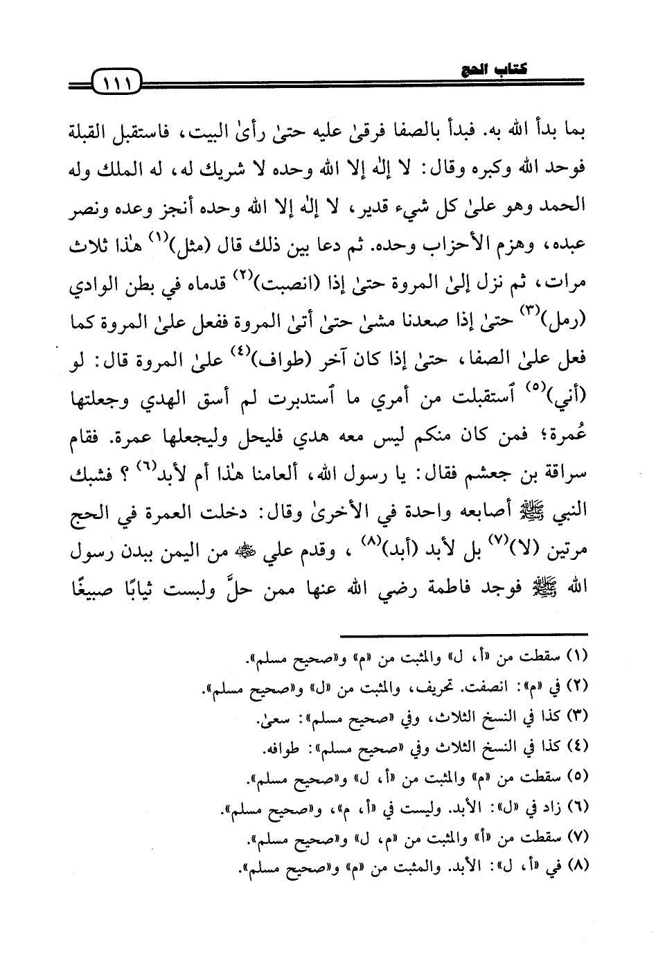 بِمَا بَدَأَ الله بِهِ. فَبَدَأَ بالصفا فرقى عَلَيْهِ حَتَّى رَأَى الْبَيْت، فَاسْتقْبل الْقبْلَة فَوحد الله وَكبره وَقَالَ: لَا إِلَه إِلَّا الله وَحده لَا شريك لَهُ، لَهُ الْملك وَله الْحَمد وَهُوَ عَلَى كل شَيْء قدير، لَا إِلَه إِلَّا الله وَحده أنْجز وعده وَنصر عَبده، وَهزمَ الْأَحْزَاب وَحده. ثمَّ دَعَا بَين ذَلِك قَالَ (مثل) هَذَا ثَلَاث مَرَّات، ثمَّ نزل إِلَى الْمَرْوَة حَتَّى إِذا (انصبت) قدماه فِي بطن الْوَادي (رمل) حَتَّى إِذا صعدنا مَشَى حَتَّى أَتَى الْمَرْوَة فَفعل عَلَى الْمَرْوَة كَمَا فعل عَلَى الصَّفَا، حَتَّى إِذا كَانَ آخر (طواف) عَلَى الْمَرْوَة قَالَ: لَو (أَنِّي) اسْتقْبلت من أَمْرِي مَا اسْتَدْبَرت لم أسق الْهَدْي وجعلتها عُمرة؛ فَمن كَانَ مِنْكُم لَيْسَ مَعَه هدي فليحل وليجعلها عمْرَة. فَقَامَ سراقَة بن جعْشم فَقَالَ: يَا رَسُول الله، ألعامنا هَذَا أم لأبد؟ فشبك النَّبِي - صَلَّى الله عَلَيْهِ وَسلم - أَصَابِعه وَاحِدَة فِي الْأُخْرَى وَقَالَ: دخلت الْعمرَة فِي الْحَج مرَّتَيْنِ (لَا) بل لأبد (أَبَد) ، وَقدم عَلّي رَضِيَ اللَّهُ عَنْه من الْيمن ببدن رَسُول الله - صَلَّى الله عَلَيْهِ وَسلم - فَوجدَ فَاطِمَة رَضِيَ اللَّهُ عَنْها مِمَّن حلَّ ولبست ثيابًا صبيغًا