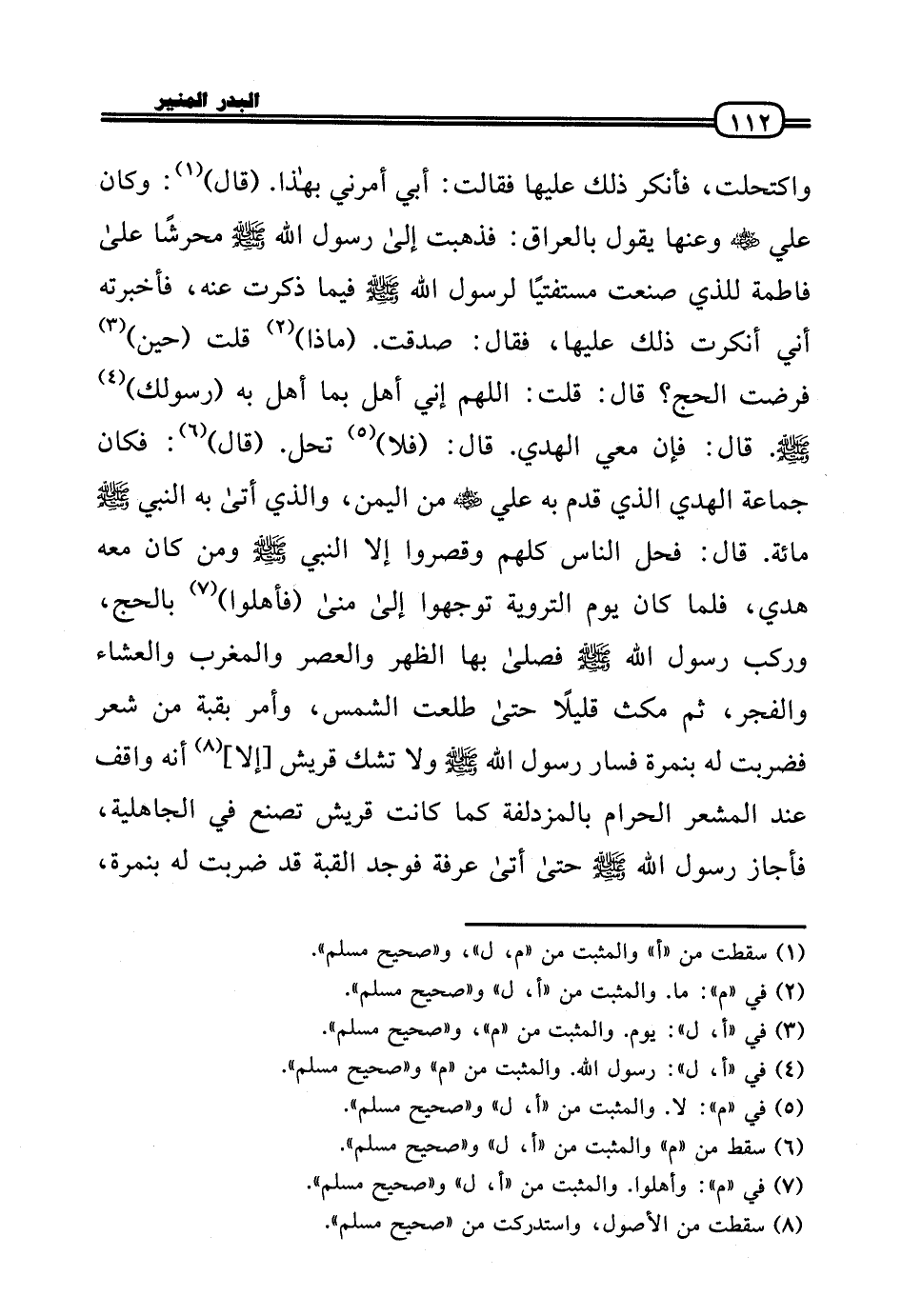واكتحلت، فَأنْكر ذَلِك عَلَيْهَا فَقَالَت: أبي أَمرنِي بِهَذَا. (قَالَ) : وَكَانَ عَلّي رَضِيَ اللَّهُ عَنْه وعنها يَقُول بالعراق: فَذَهَبت إِلَى رَسُول الله - صَلَّى الله عَلَيْهِ وَسلم - محرشًا عَلَى فَاطِمَة للَّذي صنعت مستفتيًا لرَسُول الله - صَلَّى الله عَلَيْهِ وَسلم - فِيمَا ذكرت عَنهُ، فَأَخْبَرته أَنِّي أنْكرت ذَلِك عَلَيْهَا، فَقَالَ: صدقت. (مَاذَا) قلت (حِين) فرضت الْحَج؟ قَالَ: قلت: اللَّهُمَّ إِنِّي أهل بِمَا أهل بِهِ (رَسُولك) (. قَالَ: فَإِن معي الْهَدْي. قَالَ: (فَلَا) تحل. (قَالَ) : فَكَانَ جمَاعَة الْهَدْي الَّذِي قدم بِهِ عَلّي رَضِيَ اللَّهُ عَنْه من الْيمن، وَالَّذِي أَتَى بِهِ النَّبِي - صَلَّى الله عَلَيْهِ وَسلم - مائَة. قَالَ: فَحل النَّاس كلهم وَقصرُوا إِلَّا النَّبِي - صَلَّى الله عَلَيْهِ وَسلم - وَمن كَانَ مَعَه هدي، فَلَمَّا كَانَ يَوْم التَّرويَة توجهوا إِلَى منى (فأهلوا) بِالْحَجِّ، وَركب رَسُول الله - صَلَّى الله عَلَيْهِ وَسلم - فَصَلى بهَا الظّهْر وَالْعصر وَالْمغْرب وَالْعشَاء وَالْفَجْر، ثمَّ مكث قَلِيلا حَتَّى طلعت الشَّمْس، وَأمر بقبة من شعر فَضربت لَهُ بنمرة فَسَار رَسُول الله - صَلَّى الله عَلَيْهِ وَسلم - وَلَا تشك قُرَيْش [إِلَّا] أَنه وَاقِف عِنْد الْمشعر الْحَرَام بِالْمُزْدَلِفَةِ كَمَا كَانَت قُرَيْش تصنع فِي الْجَاهِلِيَّة، فَأجَاز رَسُول الله - صَلَّى الله عَلَيْهِ وَسلم - حَتَّى أَتَى عَرَفَة فَوجدَ الْقبَّة قد ضربت لَهُ بنمرة،