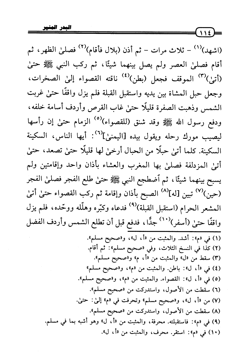 (اشْهَدْ) - ثَلَاث مَرَّات - ثمَّ أذن (بِلَال فَأَقَامَ) فَصَلى الظّهْر، ثمَّ أَقَامَ فَصَلى الْعَصْر وَلم يصل بَينهمَا شَيْئا، ثمَّ ركب النَّبِي - صَلَّى الله عَلَيْهِ وَسلم - حَتَّى (أَتَى) الْموقف فَجعل (بطن) نَاقَته الْقَصْوَاء إِلَى الصخرات، وَجعل حَبل المشاة بَين يَدَيْهِ واستقبل الْقبْلَة فَلم يزل وَاقِفًا حَتَّى غربت الشَّمْس وَذَهَبت الصُّفْرَة قَلِيلا حَتَّى غَابَ القرص وَأَرْدَفَ أُسَامَة خَلفه، وَدفع رَسُول الله - صَلَّى الله عَلَيْهِ وَسلم - وَقد شنق (للقصواء) الزِّمَام حَتَّى إِن رَأسهَا ليصيب مورك رَحْله وَيَقُول بِيَدِهِ [الْيُمْنَى] : أَيهَا النَّاس، السكينَة السكينَة. كلما أَتَى حبلاً من الحبال أَرْخَى لَهَا قَلِيلا حَتَّى تصعد، حَتَّى أَتَى الْمزْدَلِفَة فَصَلى بهَا الْمغرب وَالْعشَاء بِأَذَان وَاحِد وَإِقَامَتَيْنِ وَلم يسبح بَينهمَا شَيْئا، ثمَّ اضْطجع النَّبِي - صَلَّى الله عَلَيْهِ وَسلم - حَتَّى طلع الْفجْر فَصَلى الْفجْر (حِين) تبين [لَهُ] الصُّبْح بِأَذَان وَإِقَامَة ثمَّ ركب الْقَصْوَاء حَتَّى أَتَى الْمشعر الْحَرَام (اسْتقْبل الْقبْلَة) فَدَعَاهُ وكبّره وهلّله ووحّده، فَلم يزل وَاقِفًا حَتَّى (أَسْفر) جدًّا، فَدفع قبل أَن تطلع الشَّمْس وَأَرْدَفَ الْفضل
