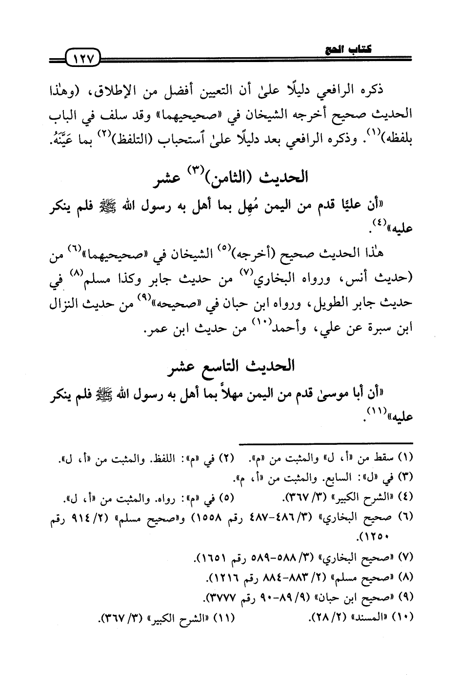 «أَن عليًّا قدم من الْيمن مهلاًّ بِمَا أهل بِهِ رَسُول الله - صَلَّى الله عَلَيْهِ وَسلم - فَلم يُنكر عَلَيْهِ» .