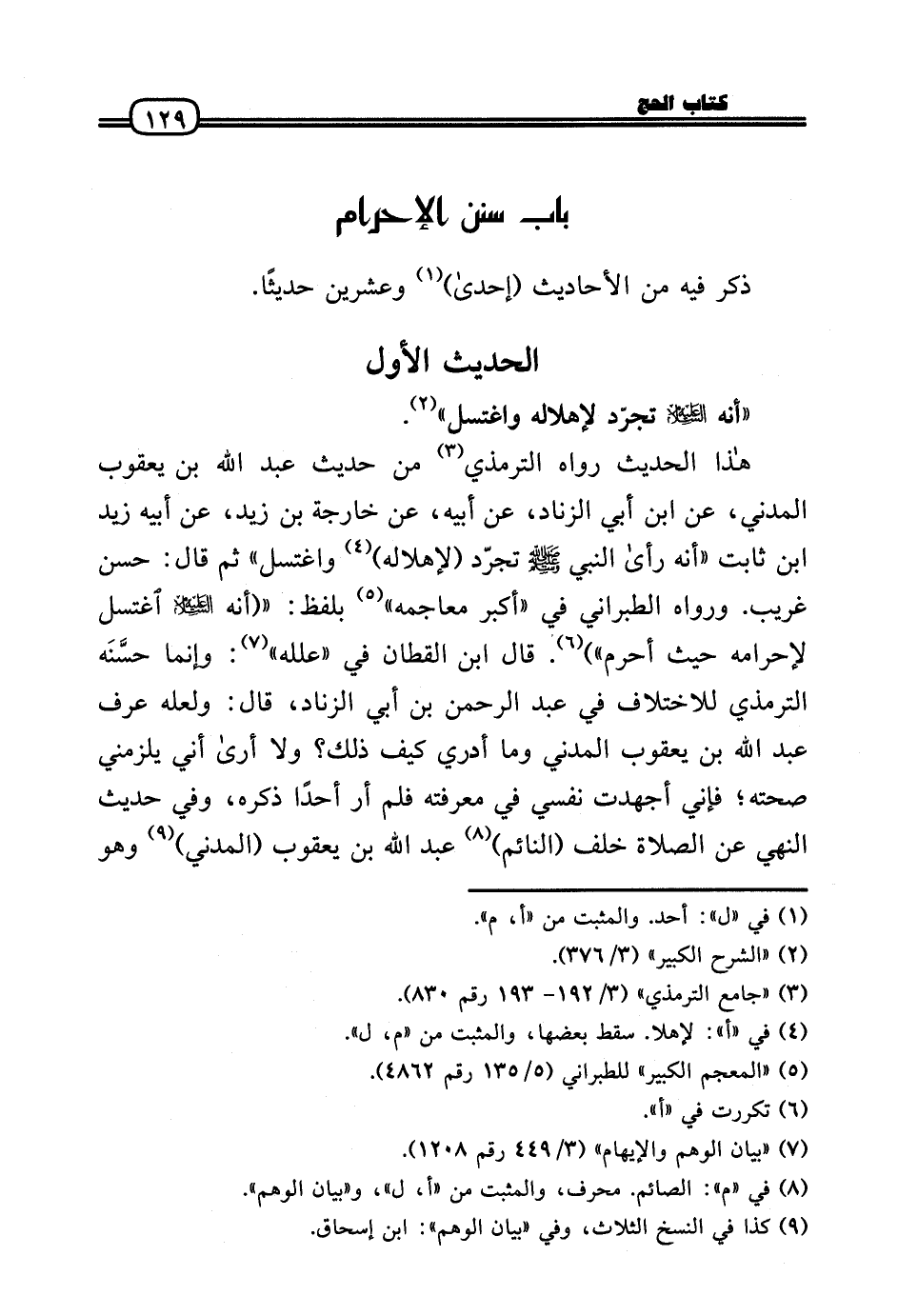 هَذَا الحَدِيث رَوَاهُ التِّرْمِذِيّ من حَدِيث عبد الله بن يَعْقُوب الْمدنِي، عَن ابْن أبي الزِّنَاد، عَن أَبِيه، عَن خَارِجَة بن زيد، عَن أَبِيه زيد بن ثَابت «أَنه رَأَى النَّبِي - صَلَّى الله عَلَيْهِ وَسلم - تجرّد (لإهلاله) واغتسل» ثمَّ قَالَ: حسن غَرِيب. وَرَوَاهُ الطَّبَرَانِيّ فِي «أكبر معاجمه» بِلَفْظ: « (أَنه عَلَيْهِ السَّلَام اغْتسل لإحرامه حَيْثُ أحرم» ) . قَالَ ابْن الْقطَّان فِي «علله» : وَإِنَّمَا حسَّنَه التِّرْمِذِيّ للِاخْتِلَاف فِي عبد الرَّحْمَن بن أبي الزِّنَاد، قَالَ: وَلَعَلَّه عرف عبد الله بن يَعْقُوب الْمدنِي وَمَا أَدْرِي كَيفَ ذَلِك؟ وَلَا أرَى أَنِّي يلْزَمنِي صِحَّته؛ فَإِنِّي أجهدت نَفسِي فِي مَعْرفَته فَلم أر أحدا ذكره، وَفِي حَدِيث النَّهْي عَن الصَّلَاة خلف (النَّائِم) عبد الله بن يَعْقُوب (الْمدنِي) وَهُوَ