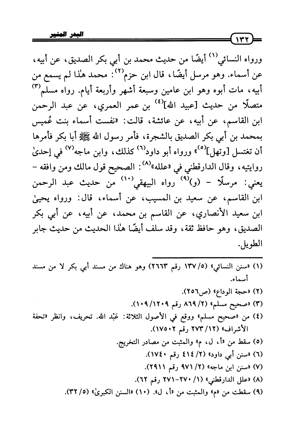 وَرَوَاهُ النَّسَائِيّ أَيْضا من حَدِيث مُحَمَّد بن أبي بكر الصّديق، عَن أَبِيه، عَن أَسمَاء. وَهُوَ مُرْسل أَيْضا، قَالَ ابْن حزم: مُحَمَّد هَذَا لم يسمع من أَبِيه، مَاتَ أَبوهُ وَهُوَ ابْن عَاميْنِ وَسَبْعَة أشهر وَأَرْبَعَة أَيَّام. رَوَاهُ مُسلم مُتَّصِلا من حَدِيث [عبيد الله] بن عمر الْعمريّ، عَن عبد الرَّحْمَن بن الْقَاسِم، عَن أَبِيه، عَن عَائِشَة، قَالَت: «نفست أَسمَاء بنت عُميس بِمُحَمد بن أبي بكر الصّديق بِالشَّجَرَةِ، فَأمر رَسُول الله - صَلَّى الله عَلَيْهِ وَسلم - أَبَا بكر فَأمرهَا أَن تَغْتَسِل [وتهل] » وَرَوَاهُ أَبُو دَاوُد كَذَلِك، وَابْن مَاجَه فِي إِحْدَى روايتيه، وَقَالَ الدَّارَقُطْنِيّ فِي «علله» : الصَّحِيح قَول مَالك وَمن وَافقه - يَعْنِي: مُرْسلا - (و) رَوَاهُ الْبَيْهَقِيّ من حَدِيث عبد الرَّحْمَن بن الْقَاسِم، عَن سعيد بن الْمسيب، عَن أَسمَاء، قَالَ: وَرَوَاهُ يَحْيَى بن سعيد الْأنْصَارِيّ، عَن الْقَاسِم بن مُحَمَّد، عَن أَبِيه، عَن أبي بكر الصّديق، وَهُوَ حَافظ ثِقَة، وَقد سلف أَيْضا هَذَا الحَدِيث من حَدِيث جَابر الطَّوِيل.
