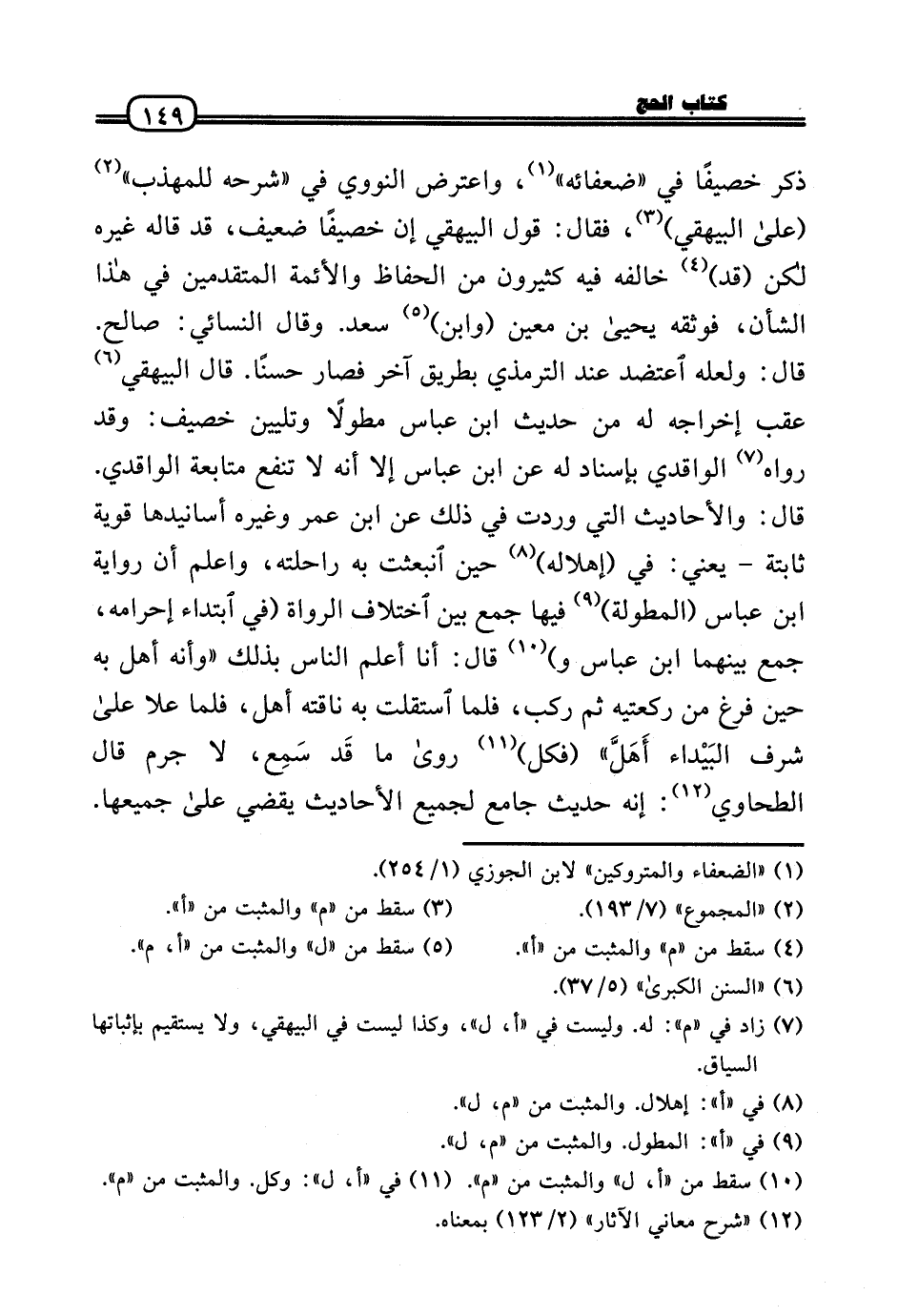 ذكر خصيفًا فِي «ضُعَفَائِهِ» ، وَاعْترض النَّوَوِيّ فِي «شَرحه للمهذب» (عَلَى الْبَيْهَقِيّ) ، فَقَالَ: قَول الْبَيْهَقِيّ إِن خصيفًا ضَعِيف، قد قَالَه غَيره لَكِن (قد) خَالفه فِيهِ كَثِيرُونَ من الْحفاظ وَالْأَئِمَّة الْمُتَقَدِّمين فِي هَذَا الشَّأْن، فوثقه يَحْيَى بن معِين (وَابْن) سعد. وَقَالَ النَّسَائِيّ: صَالح. قَالَ: وَلَعَلَّه اعتضد عِنْد التِّرْمِذِيّ بطرِيق آخر فَصَارَ حسنا. قَالَ الْبَيْهَقِيّ عقب إِخْرَاجه لَهُ من حَدِيث ابْن عَبَّاس مطولا وتليين خصيف: وَقد رَوَاهُ الْوَاقِدِيّ بِإِسْنَاد لَهُ عَن ابْن عَبَّاس إِلَّا أَنه لَا تَنْفَع مُتَابعَة الْوَاقِدِيّ. قَالَ: وَالْأَحَادِيث الَّتِي وَردت فِي ذَلِك عَن ابْن عمر وَغَيره أسانيدها قَوِيَّة ثَابِتَة - يَعْنِي: فِي (إهلاله) حِين انبعثت بِهِ رَاحِلَته، وَاعْلَم أَن رِوَايَة ابْن عَبَّاس (المطولة) فِيهَا جمع بَين اخْتِلَاف الروَاة (فِي ابْتِدَاء إِحْرَامه، جمع بَينهمَا ابْن عَبَّاس و) قَالَ: أَنا أعلم النَّاس بذلك «وَأَنه أهل بِهِ حِين فرغ من ركعتيه ثمَّ ركب، فَلَمَّا اسْتَقَلت بِهِ نَاقَته أهل، فَلَمَّا علا عَلَى شرف البَيْداء أَهَلَّ» (فَكل) رَوَى مَا قَد سَمِع، لَا جرم قَالَ الطَّحَاوِيّ: إِنَّه حَدِيث جَامع لجَمِيع الْأَحَادِيث يقْضِي عَلَى جَمِيعهَا.